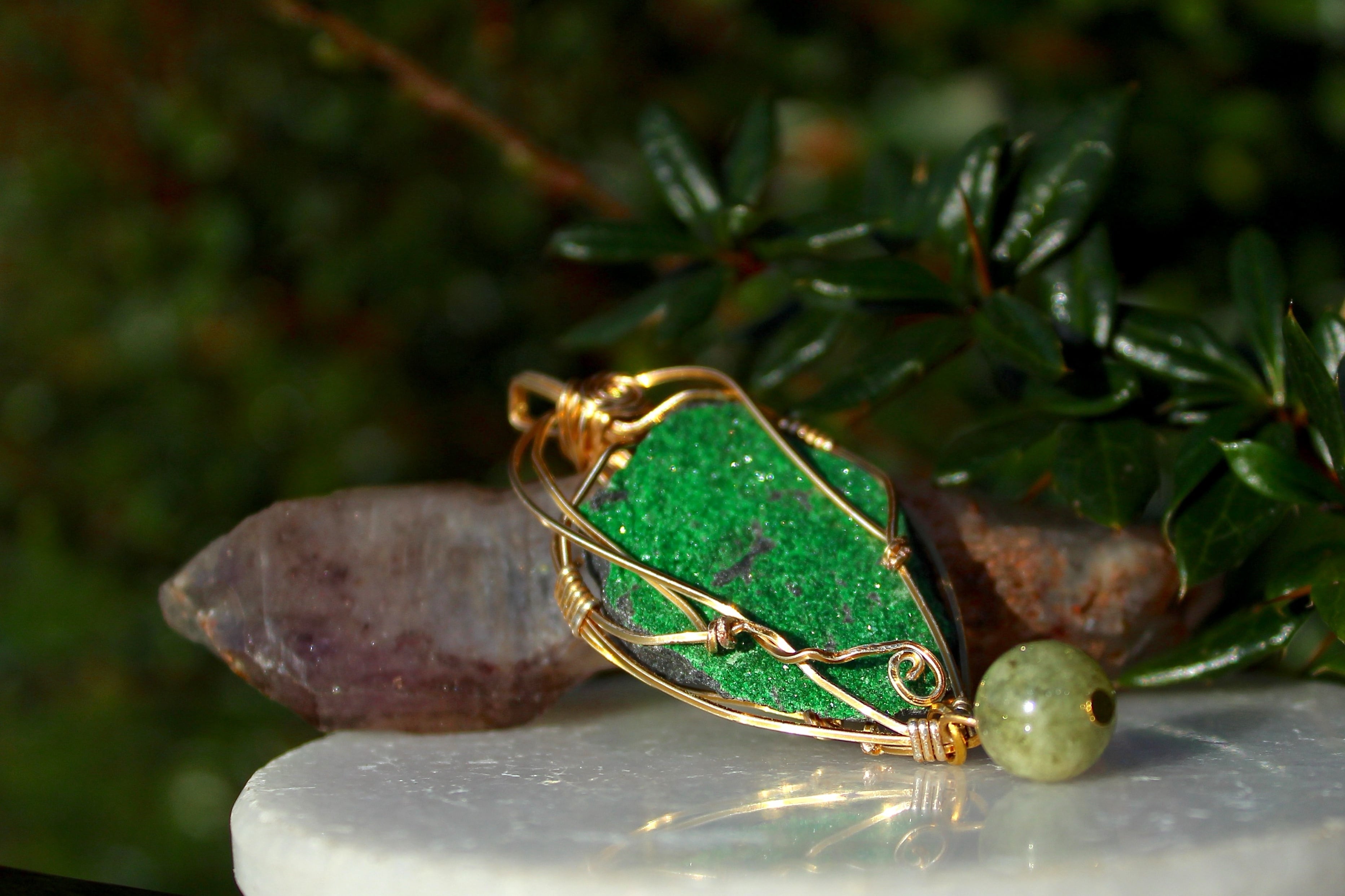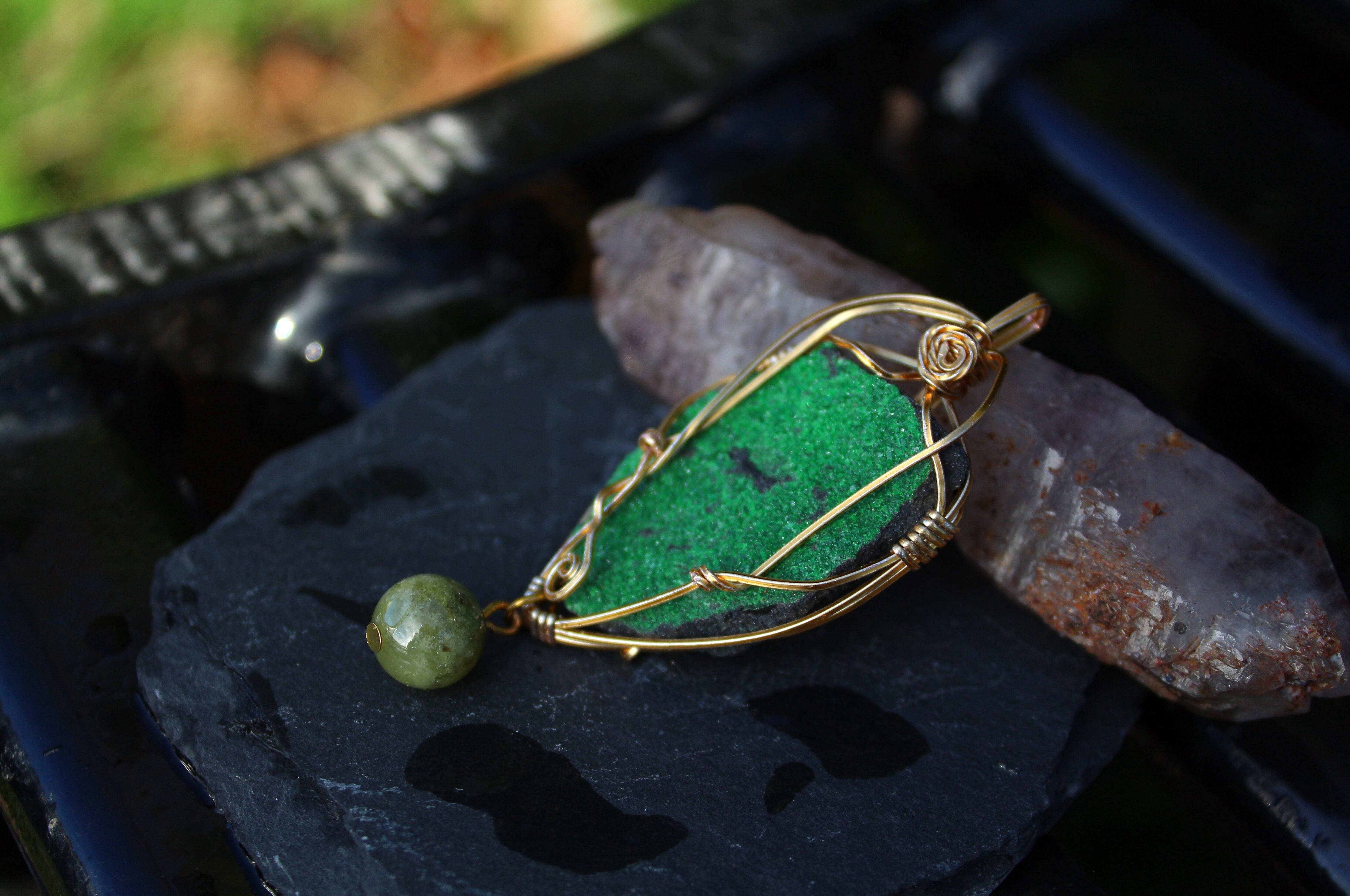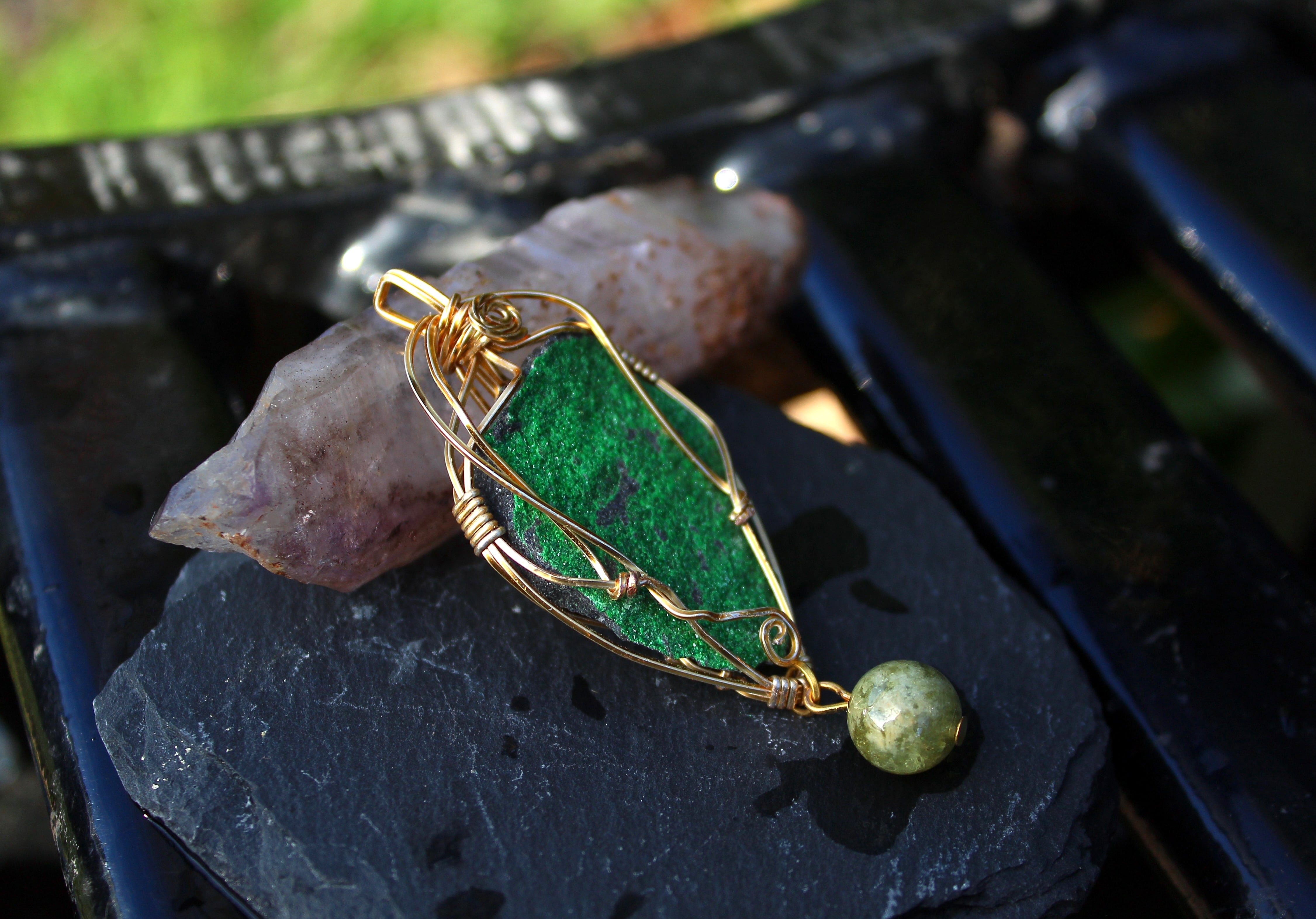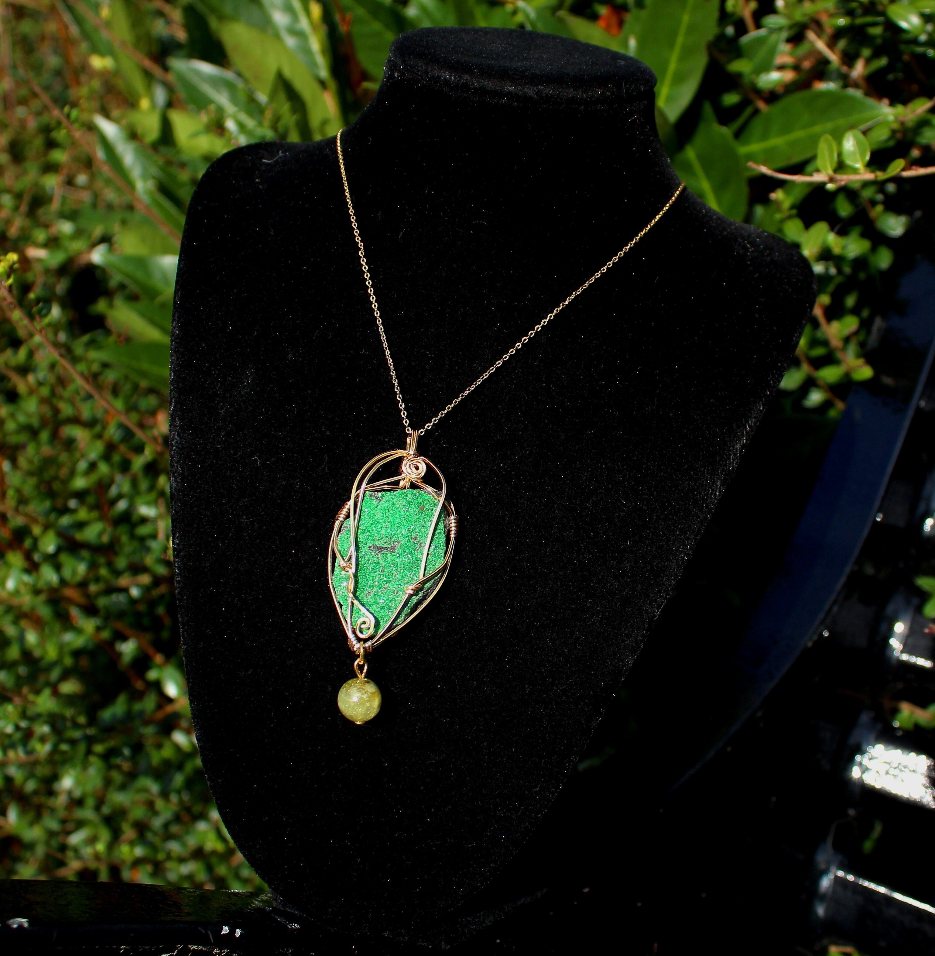 キラキラとした結晶が非常に美しいウバロバイトの原石です。ゴールドのワイヤーで巻いて、ツァボライトのビーズを付けました。