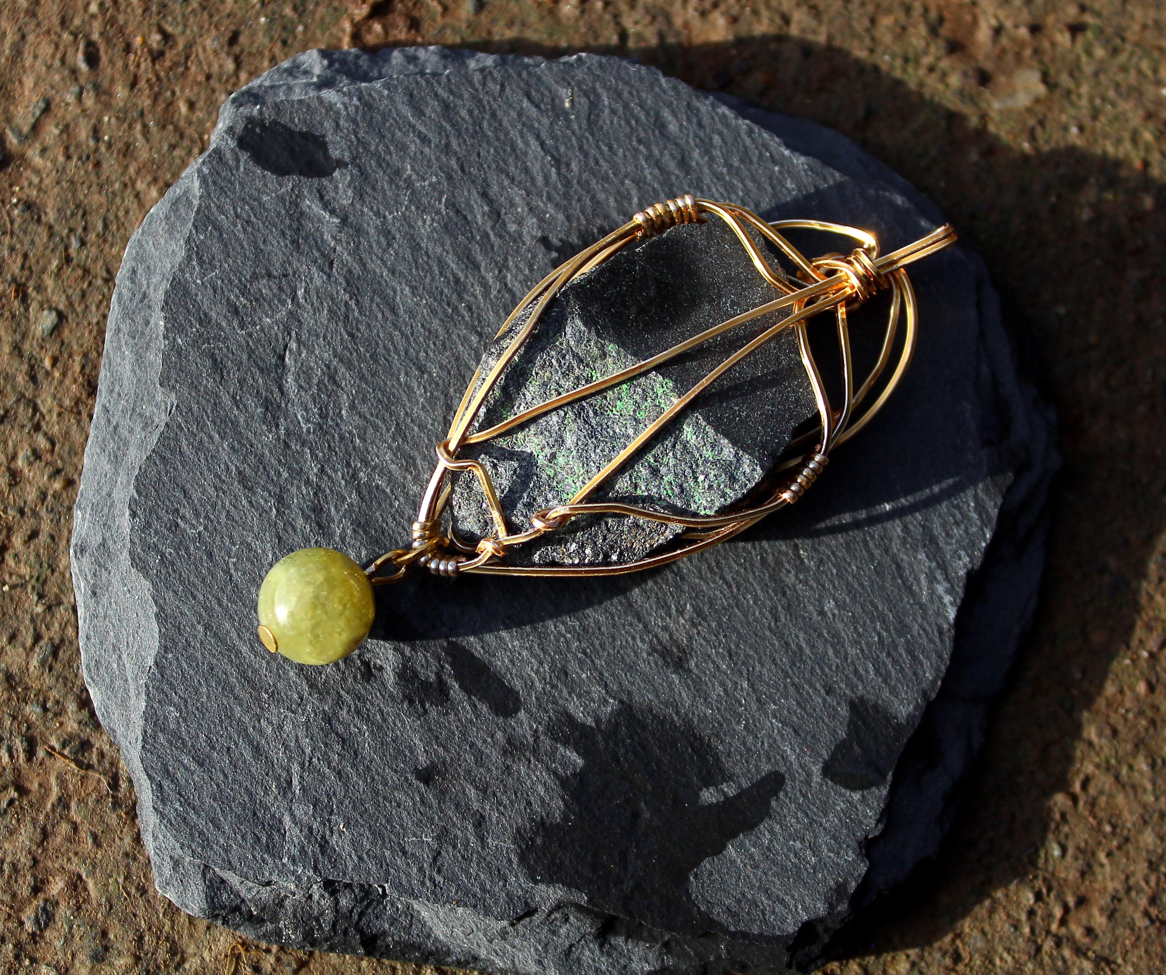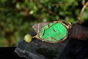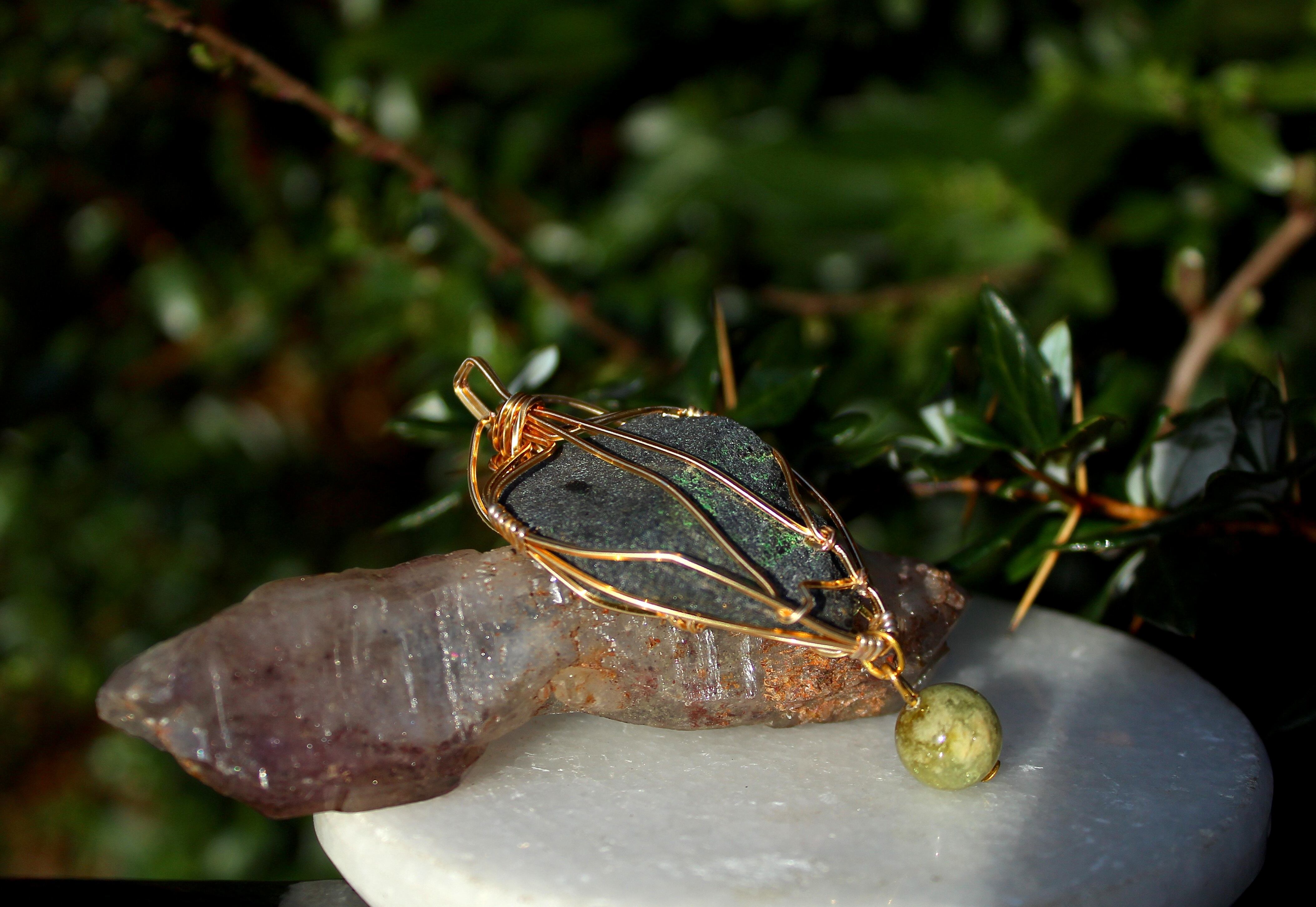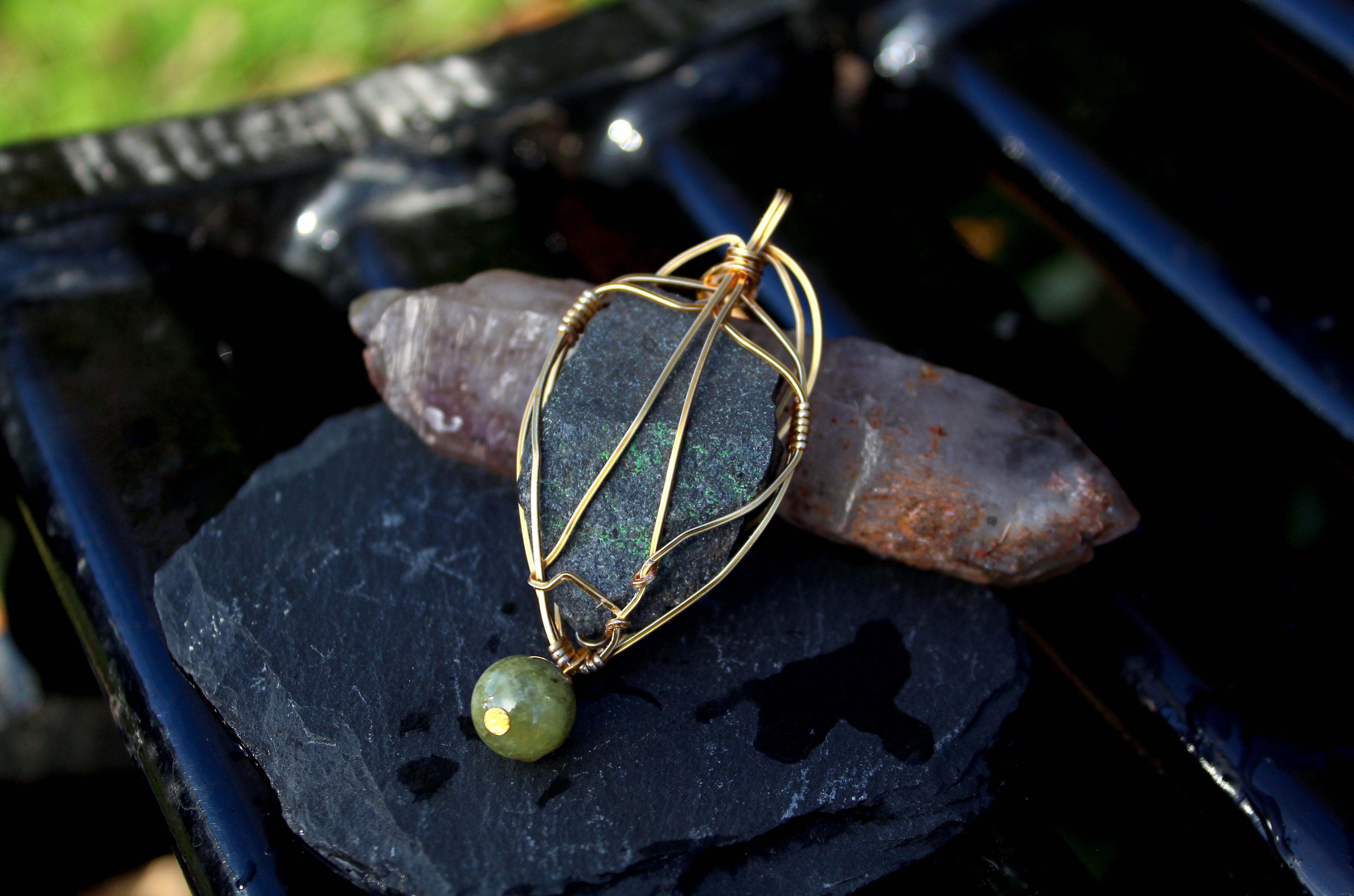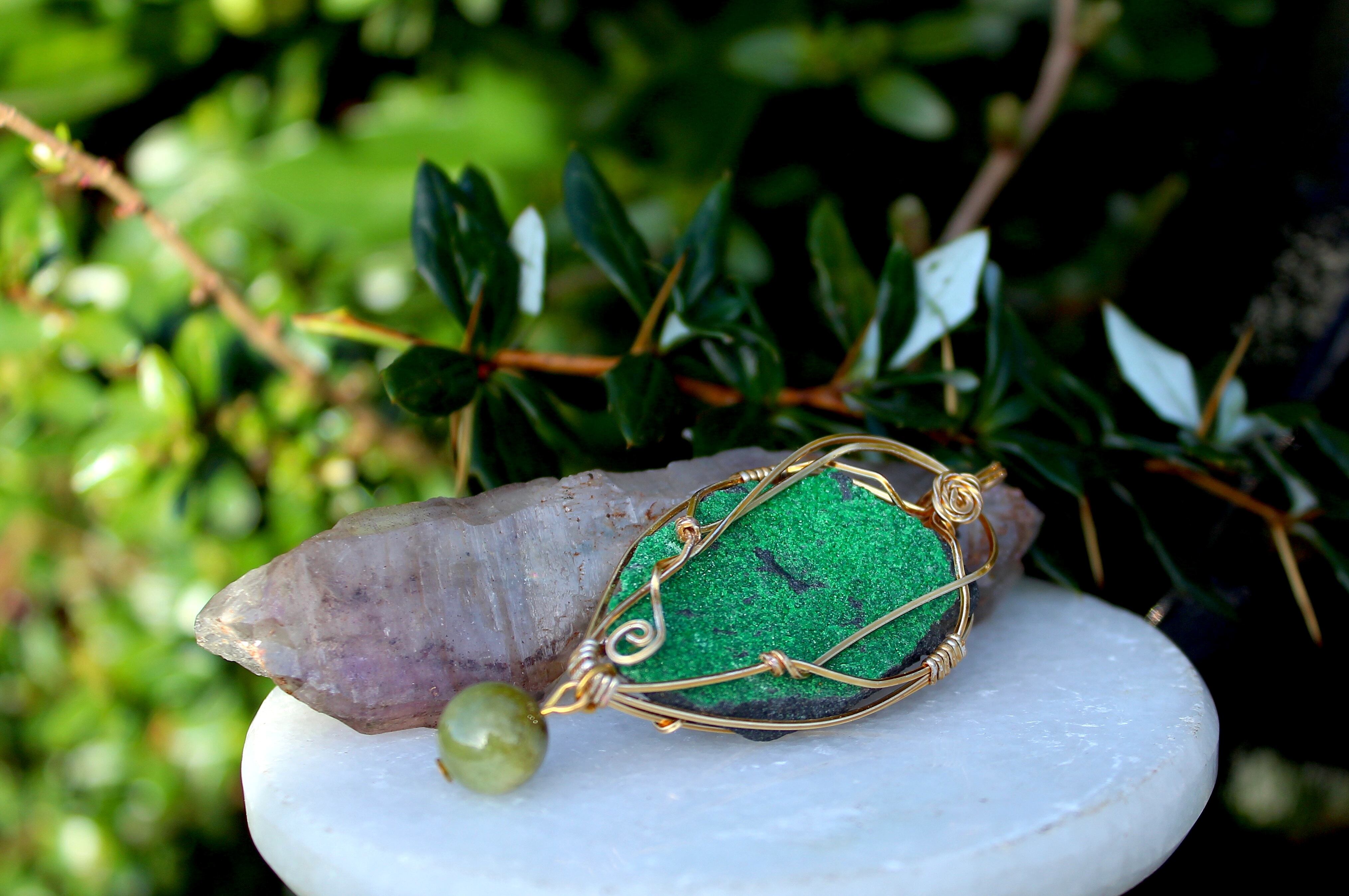 キラキラとした結晶が非常に美しいウバロバイトの原石です。ゴールドのワイヤーで巻いて、ツァボライトのビーズを付けました。