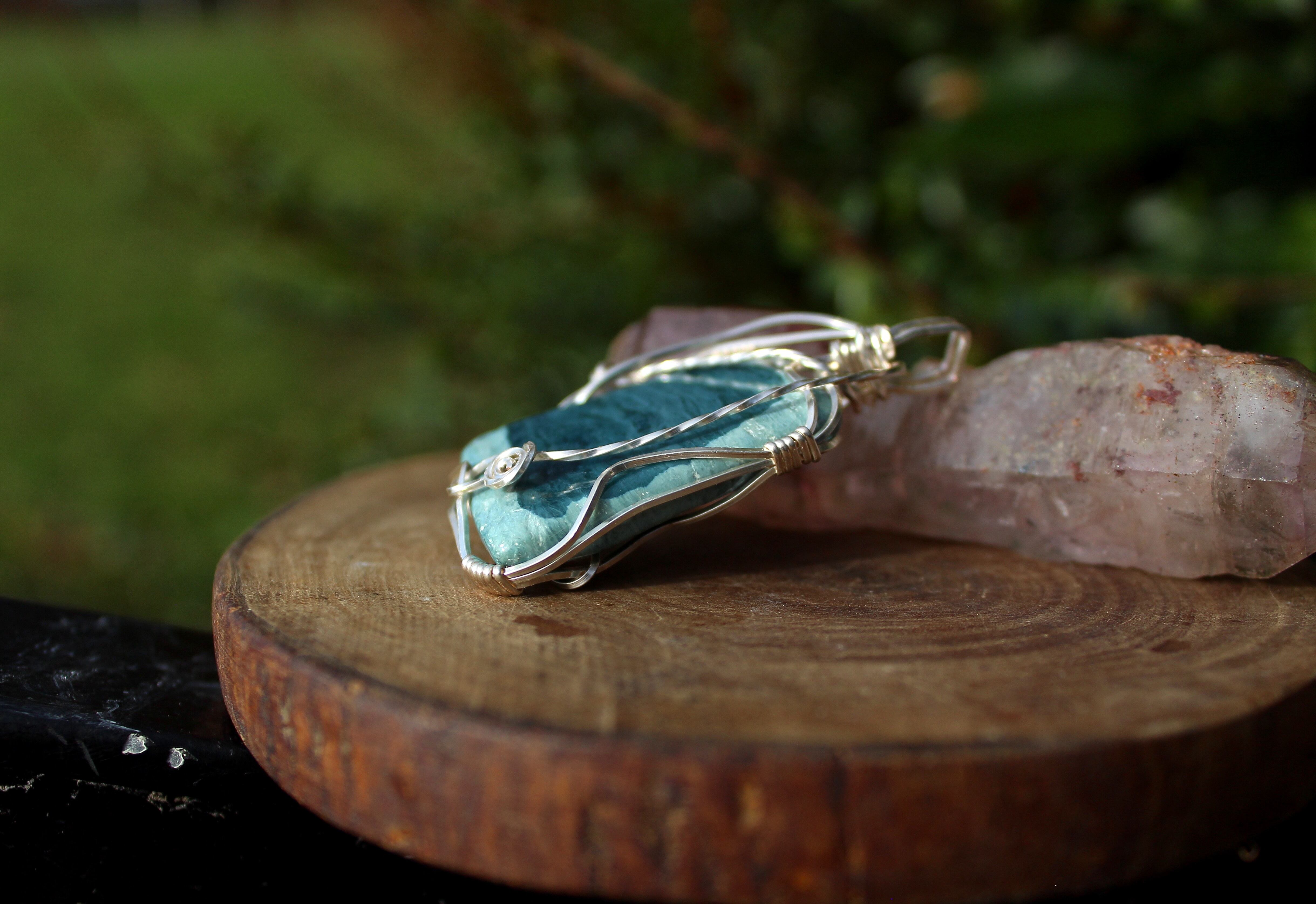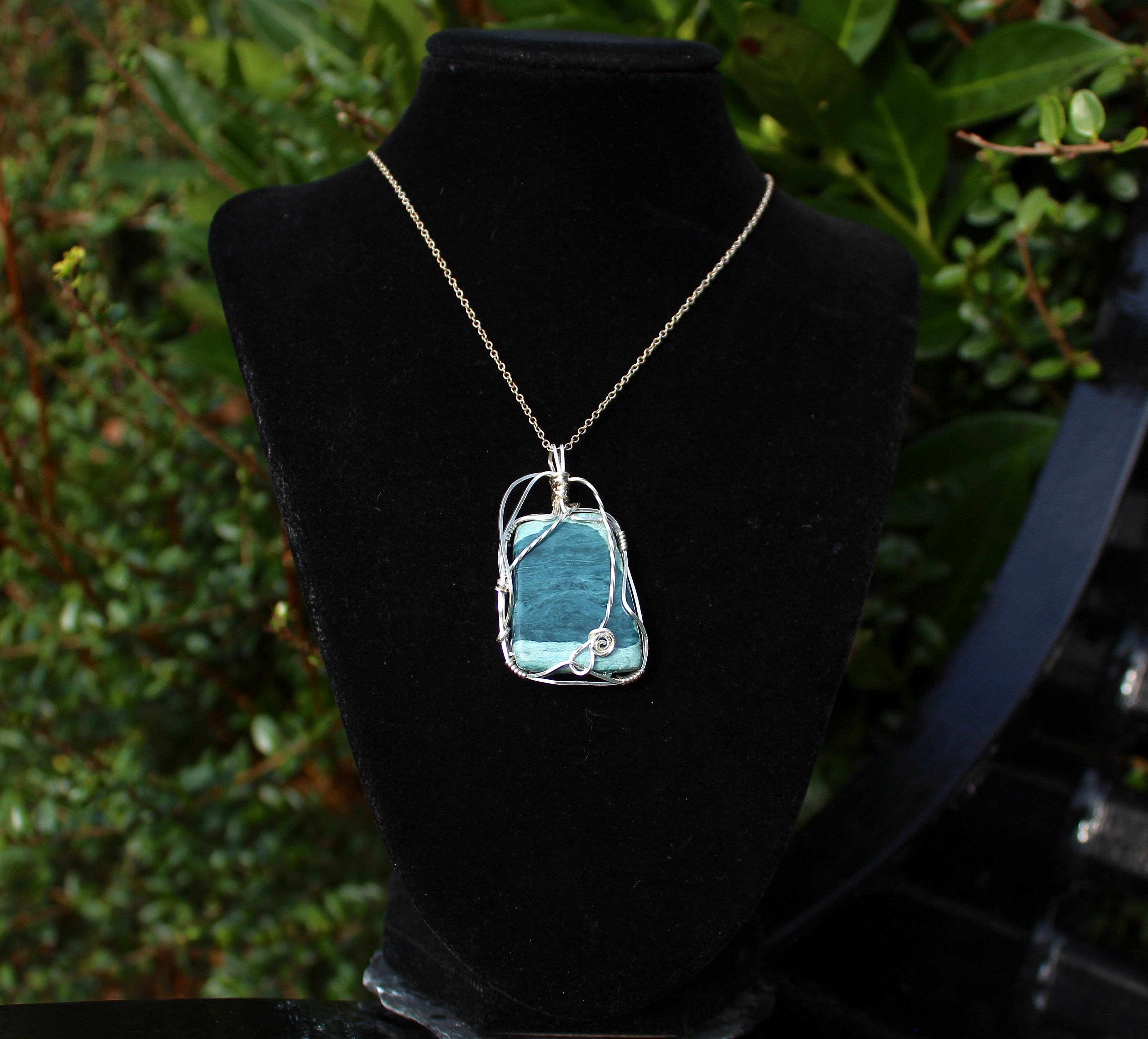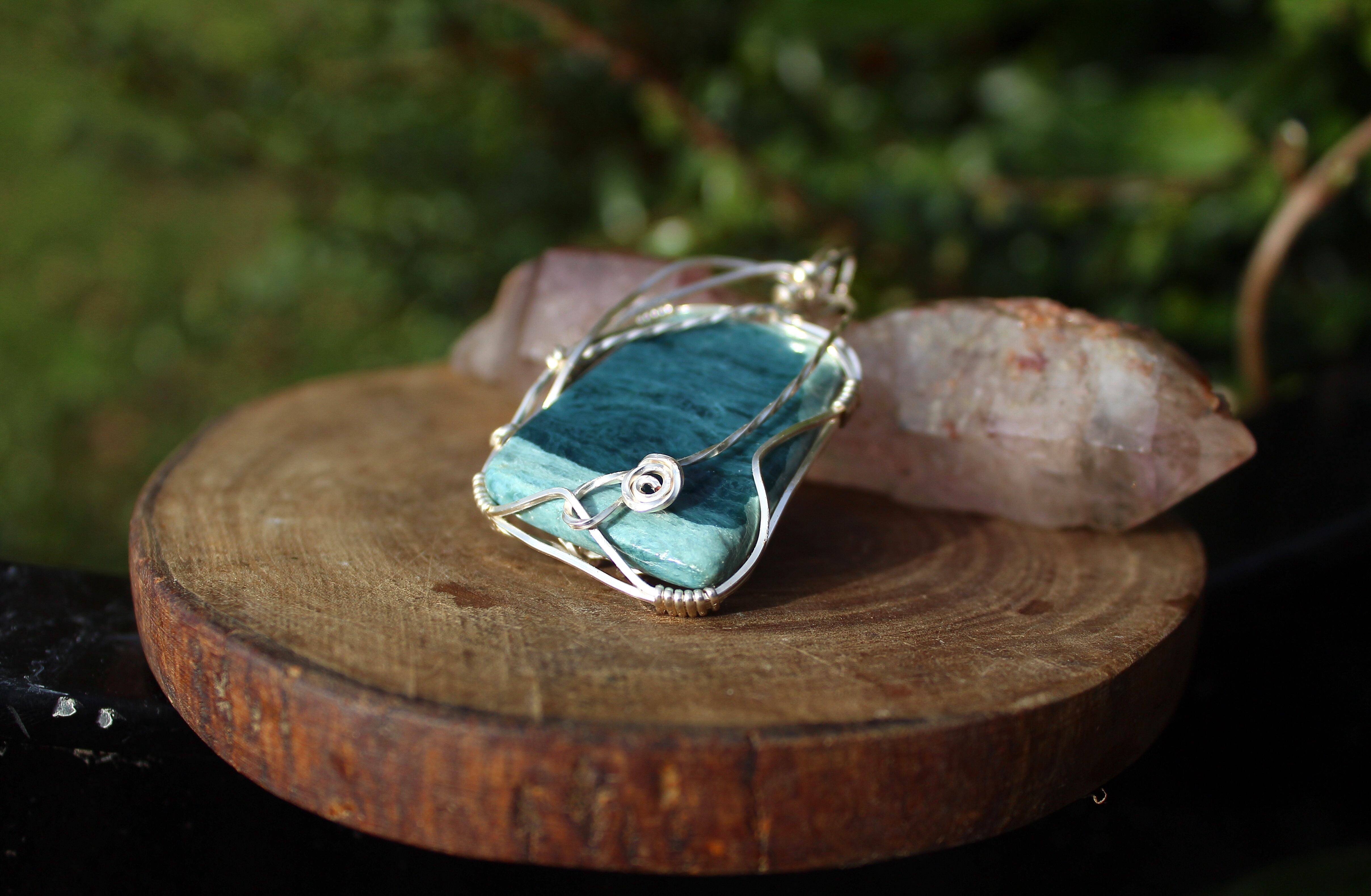 AAA級のダイアナイト、薄いブルーと濃いブルーのコラボレーションが美しい高品質のブルージェイドです。シルバーのワイヤーで上品に巻きました。