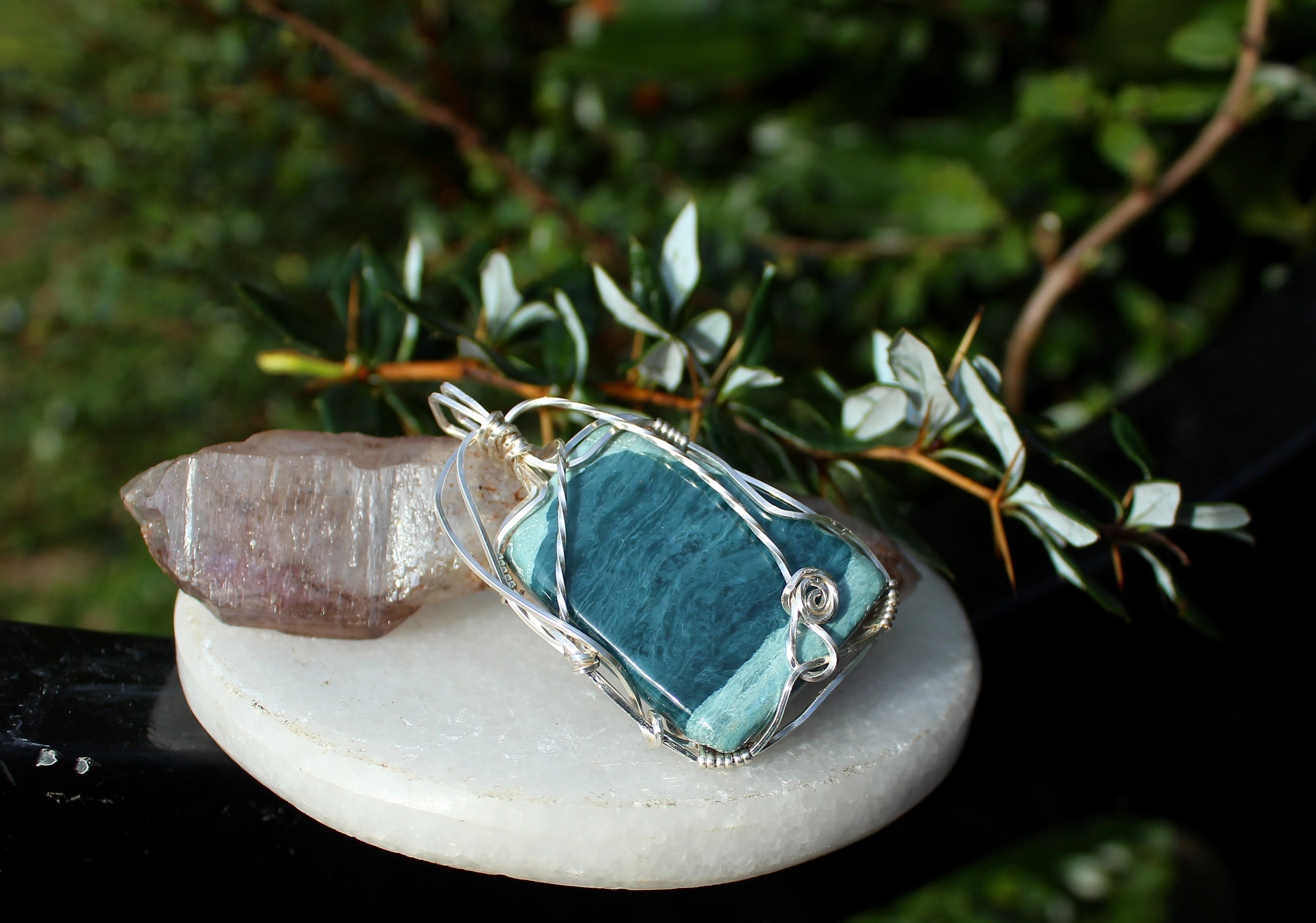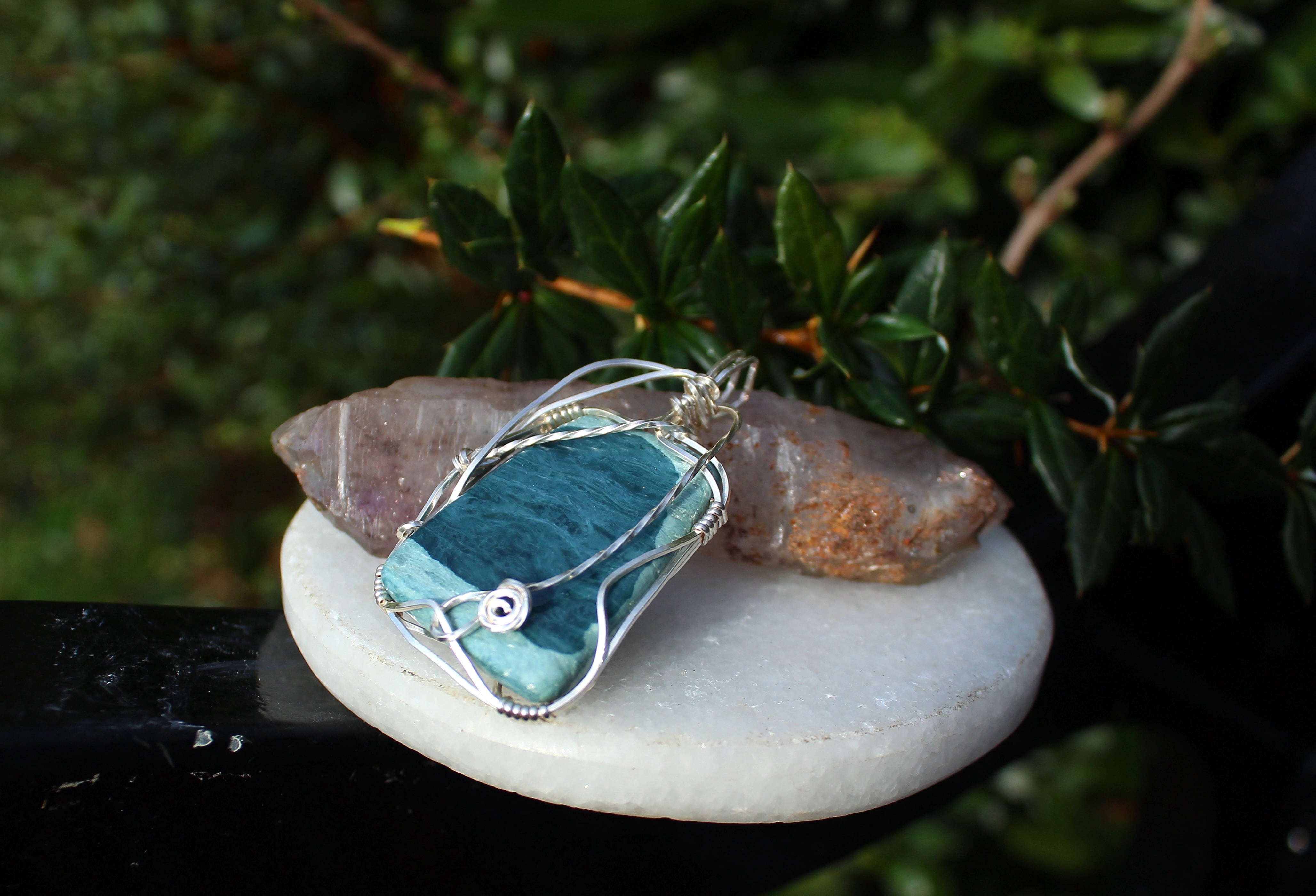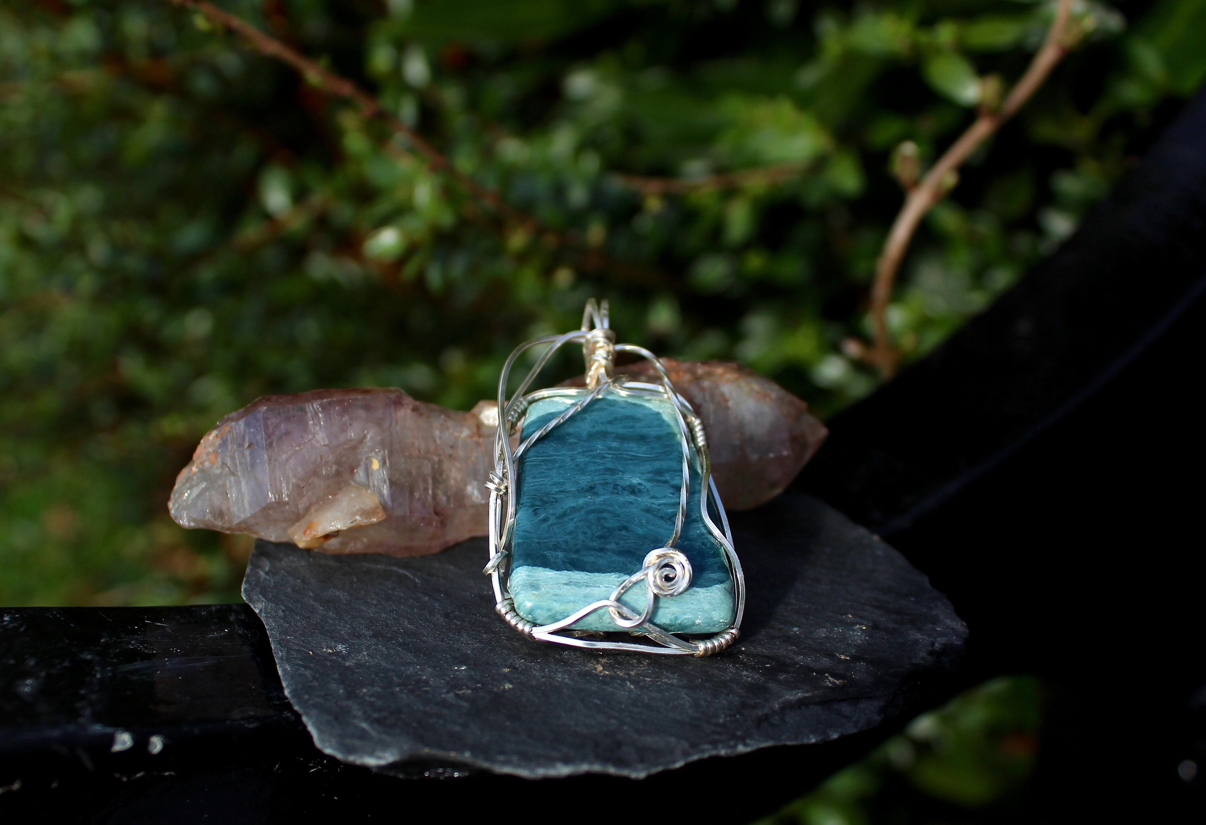 AAA級のダイアナイト、薄いブルーと濃いブルーのコラボレーションが美しい高品質のブルージェイドです。シルバーのワイヤーで上品に巻きました。