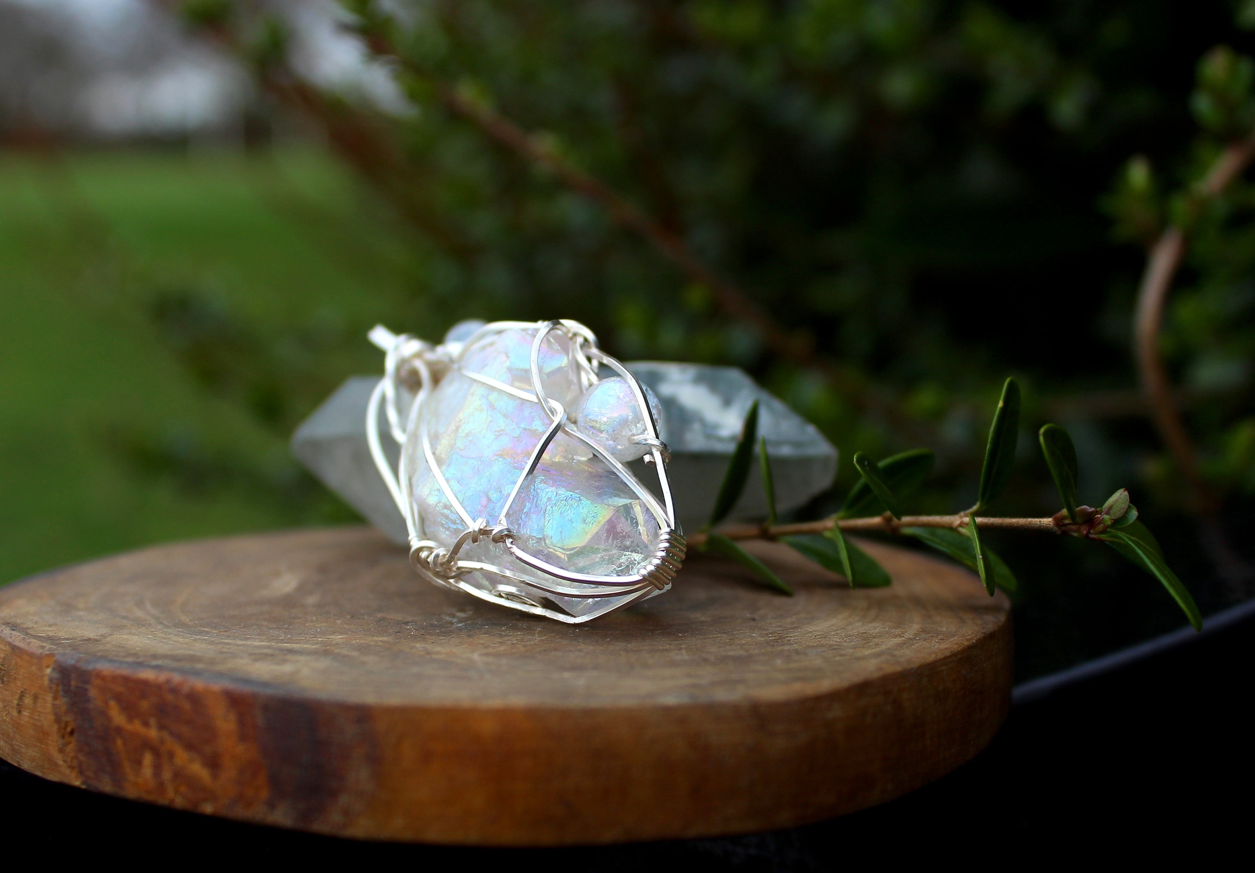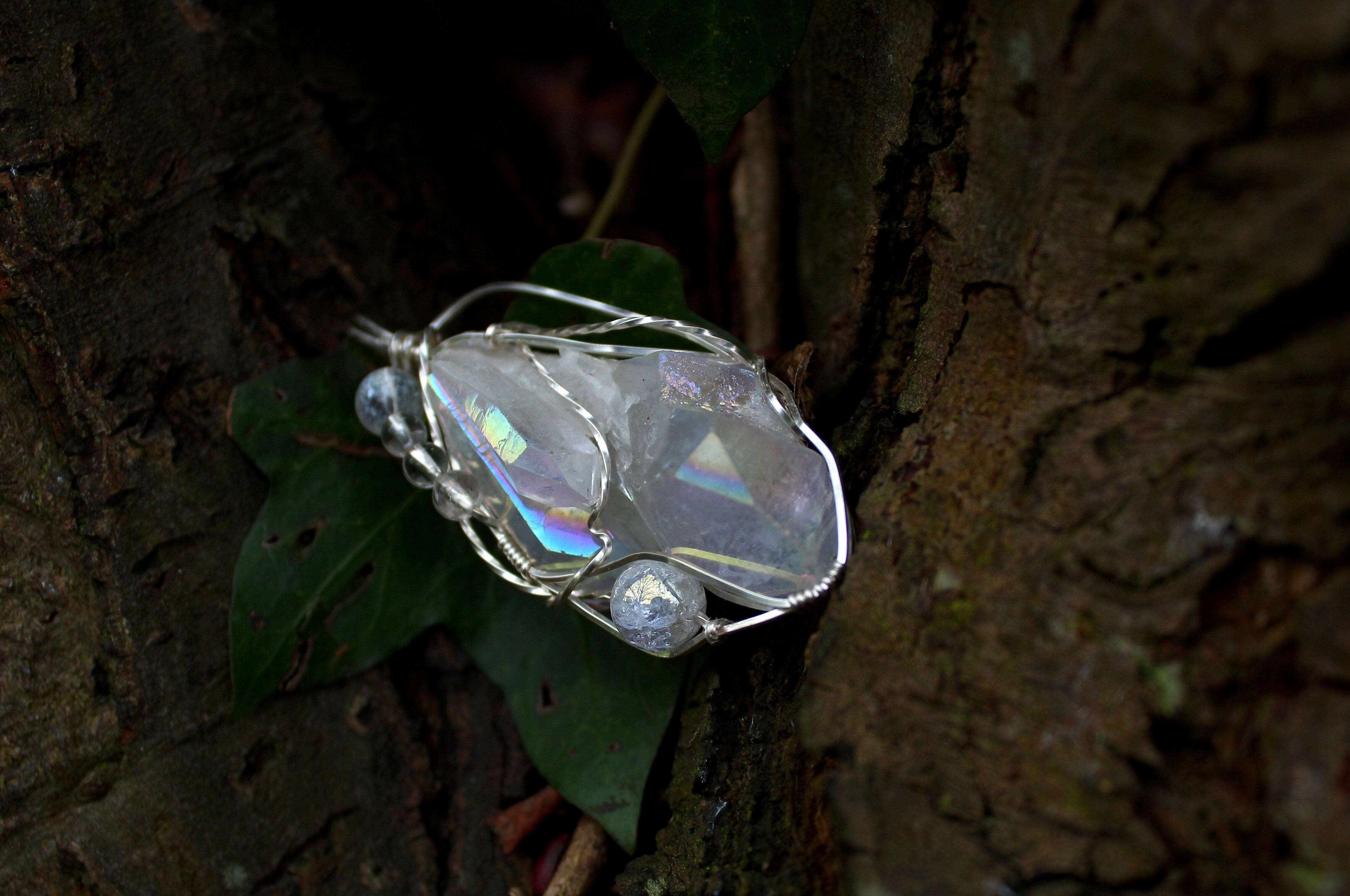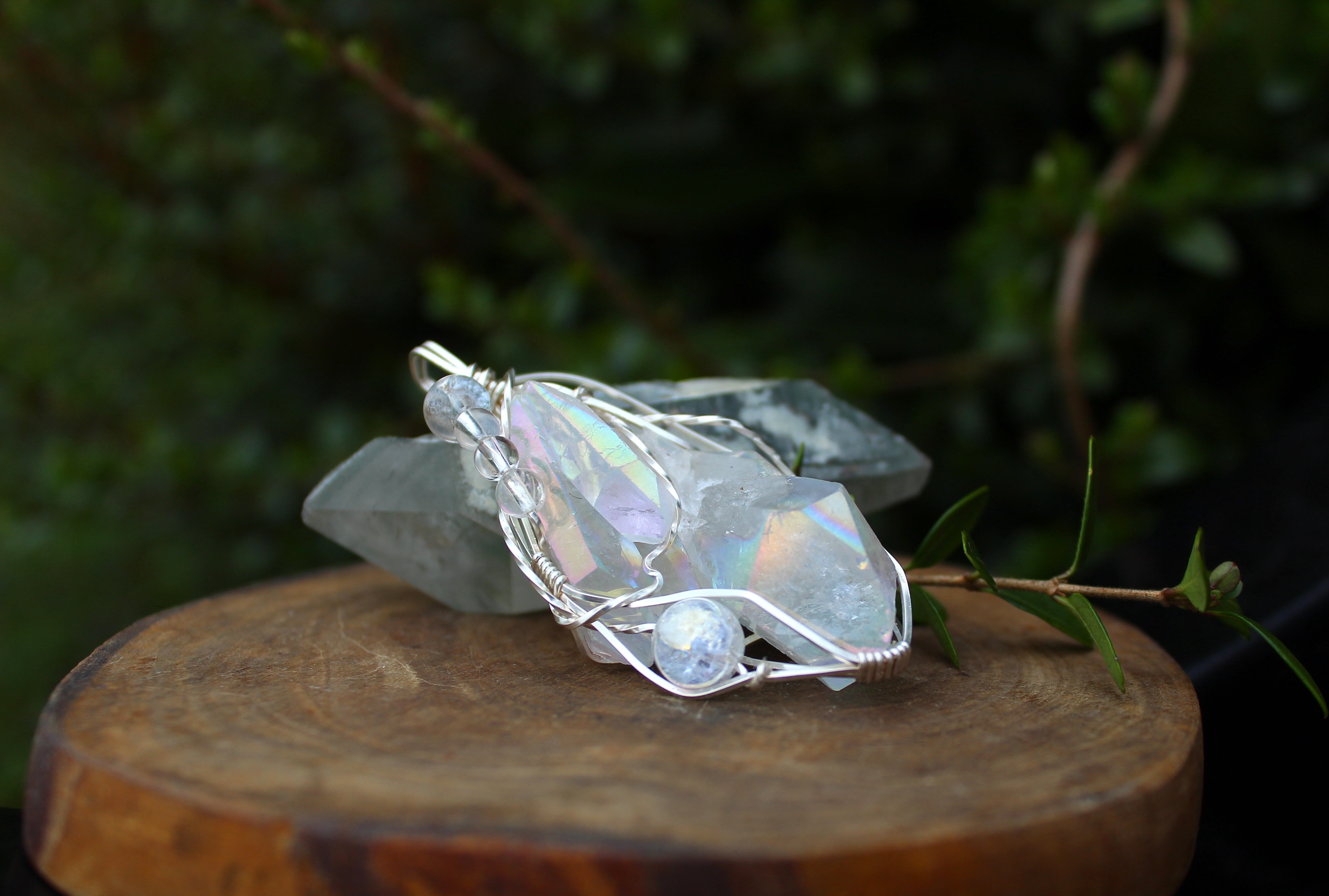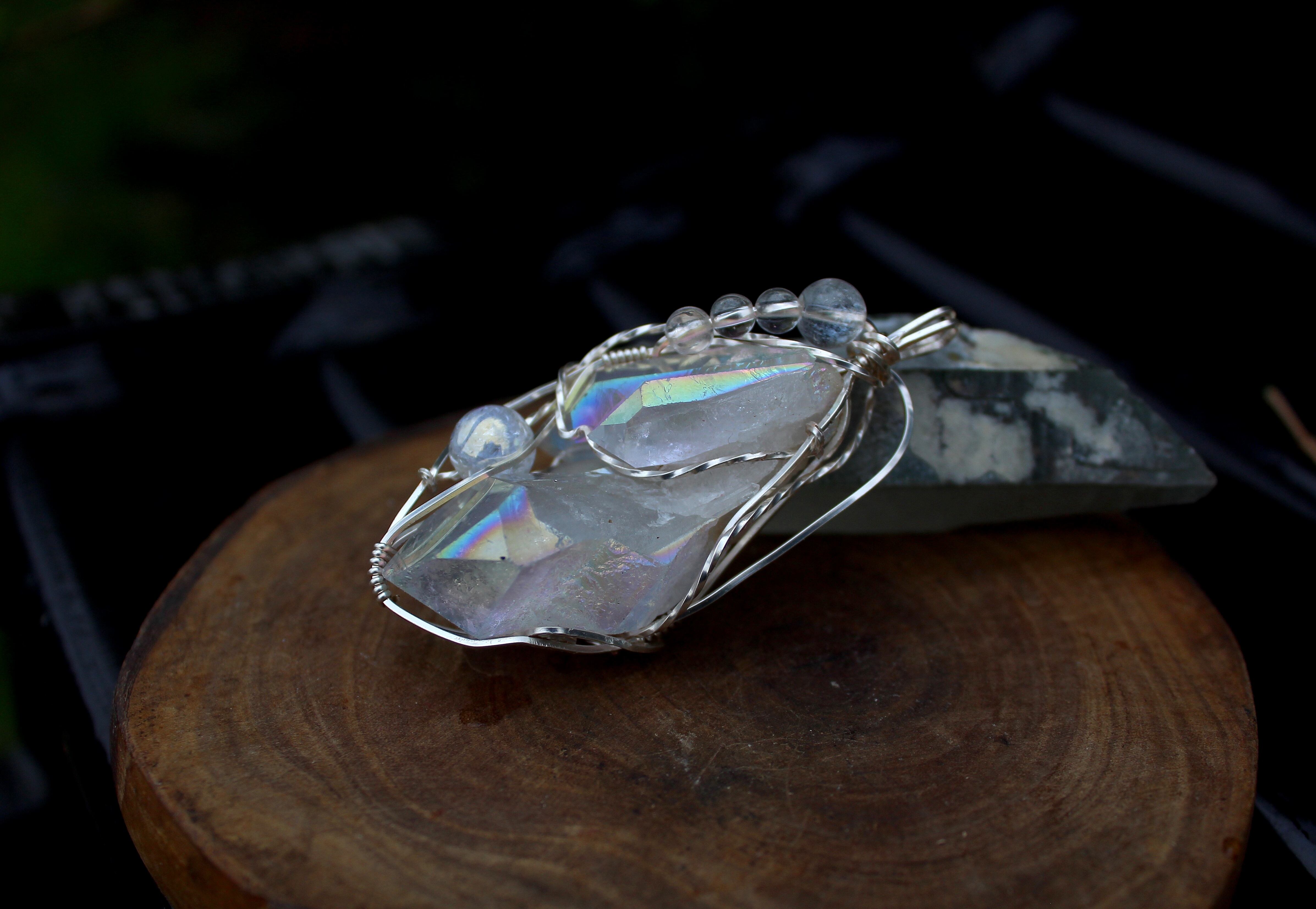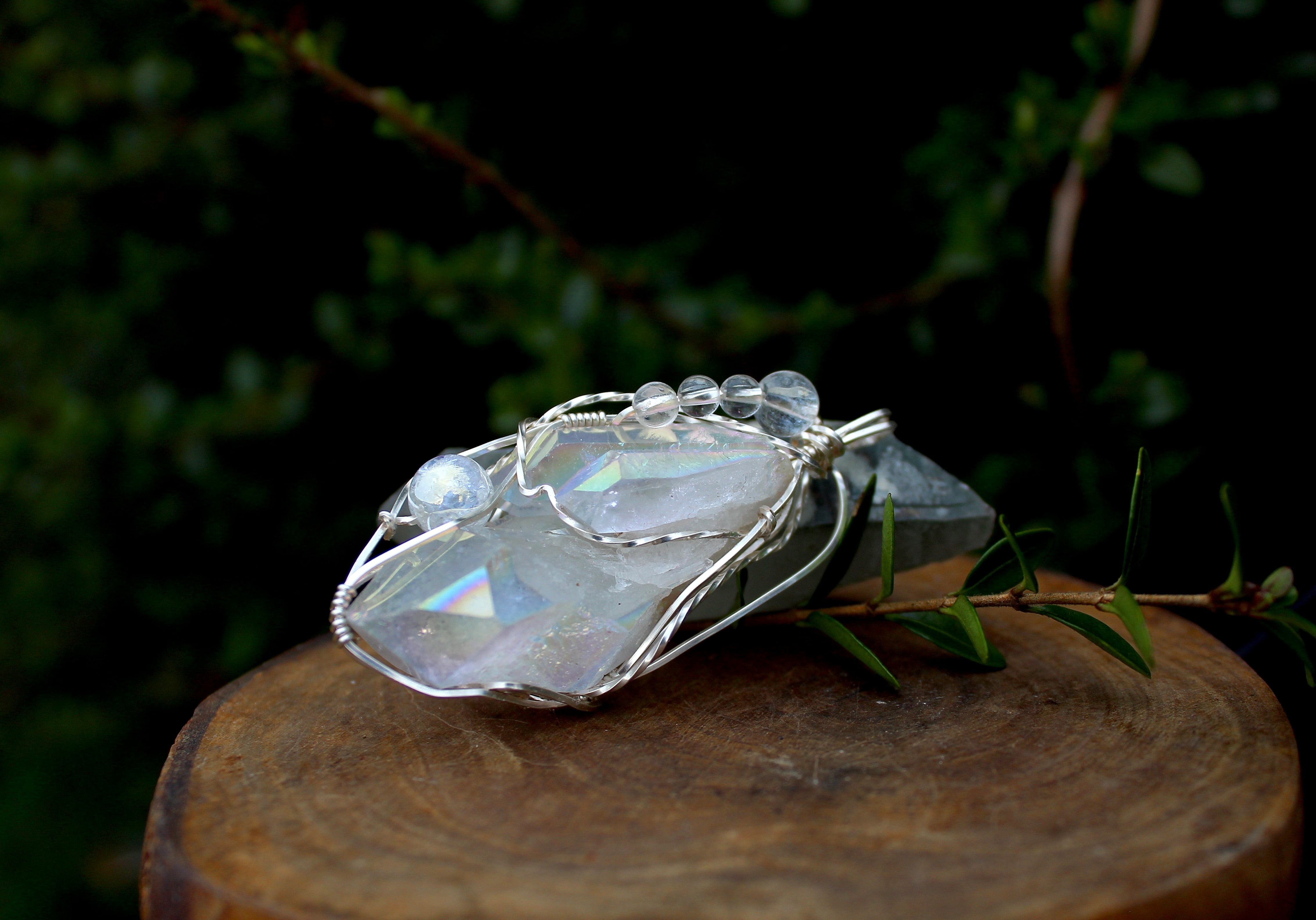 水晶に、人工的に金属を蒸着することで作られるオーラクォーツ。その中でも、プラチナを蒸着させたものがエンジェルオーラクォーツです。蒸着加工を施したことで、水晶の力が最大限に引き出され、さらに加工に用いた金属により、それぞれ固有の特性が生まれます。