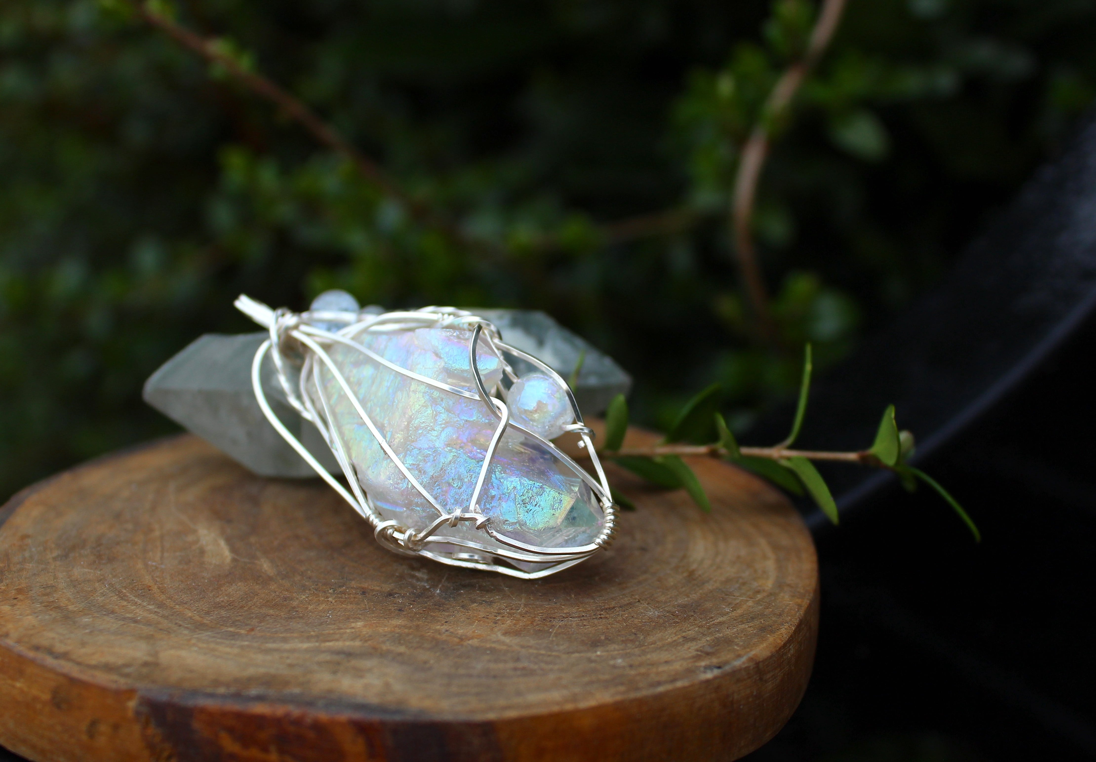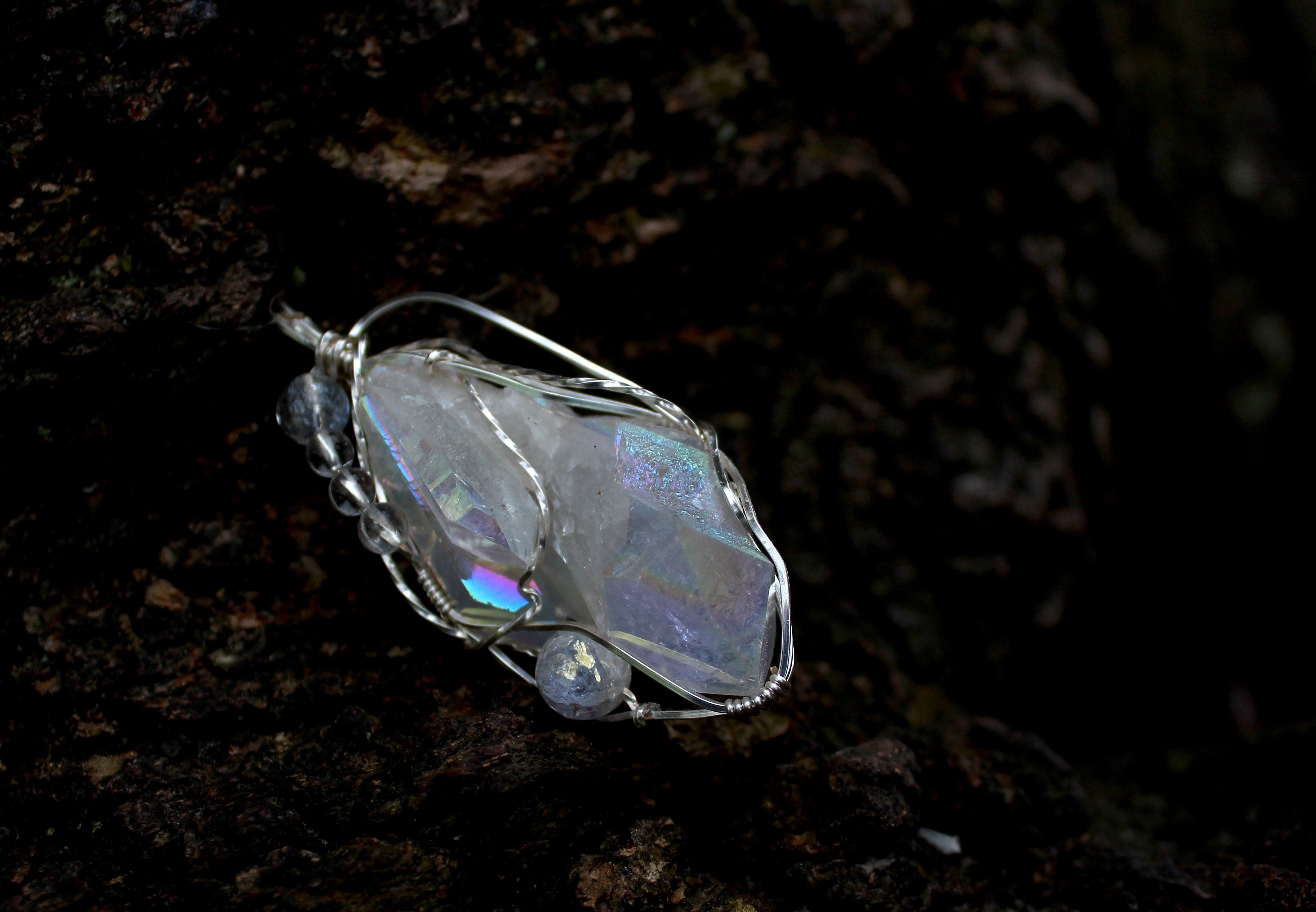 エンジェルオーラクォーツは、非常にポジティブで強力なエネルギーを持つ、美しい虹色のクリスタルです。この石は、クラウンチャクラを浄化し、バランスを取り、ライトボディを物理的な次元に統合する手助けをしてくれます。宇宙の領域から受け取った情報を肉体に根付かせる、深い瞑想的意識を作り出すために使用できます。宇宙意識と地球意識に深い絆と祝福をもたらす石です。形而上学的機能と実質的な外観を持つ、本物のマジカルクリスタルと言えます。