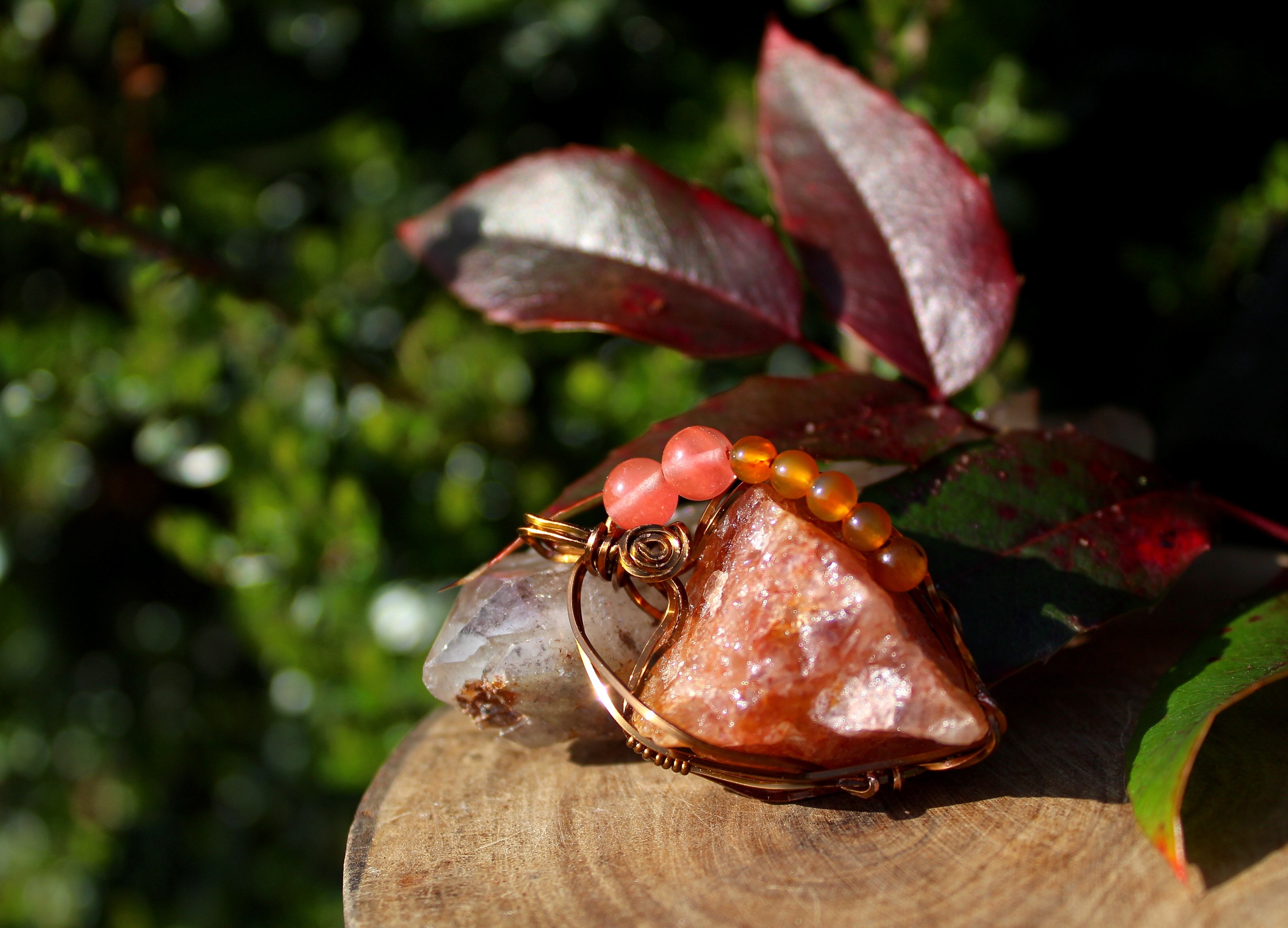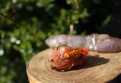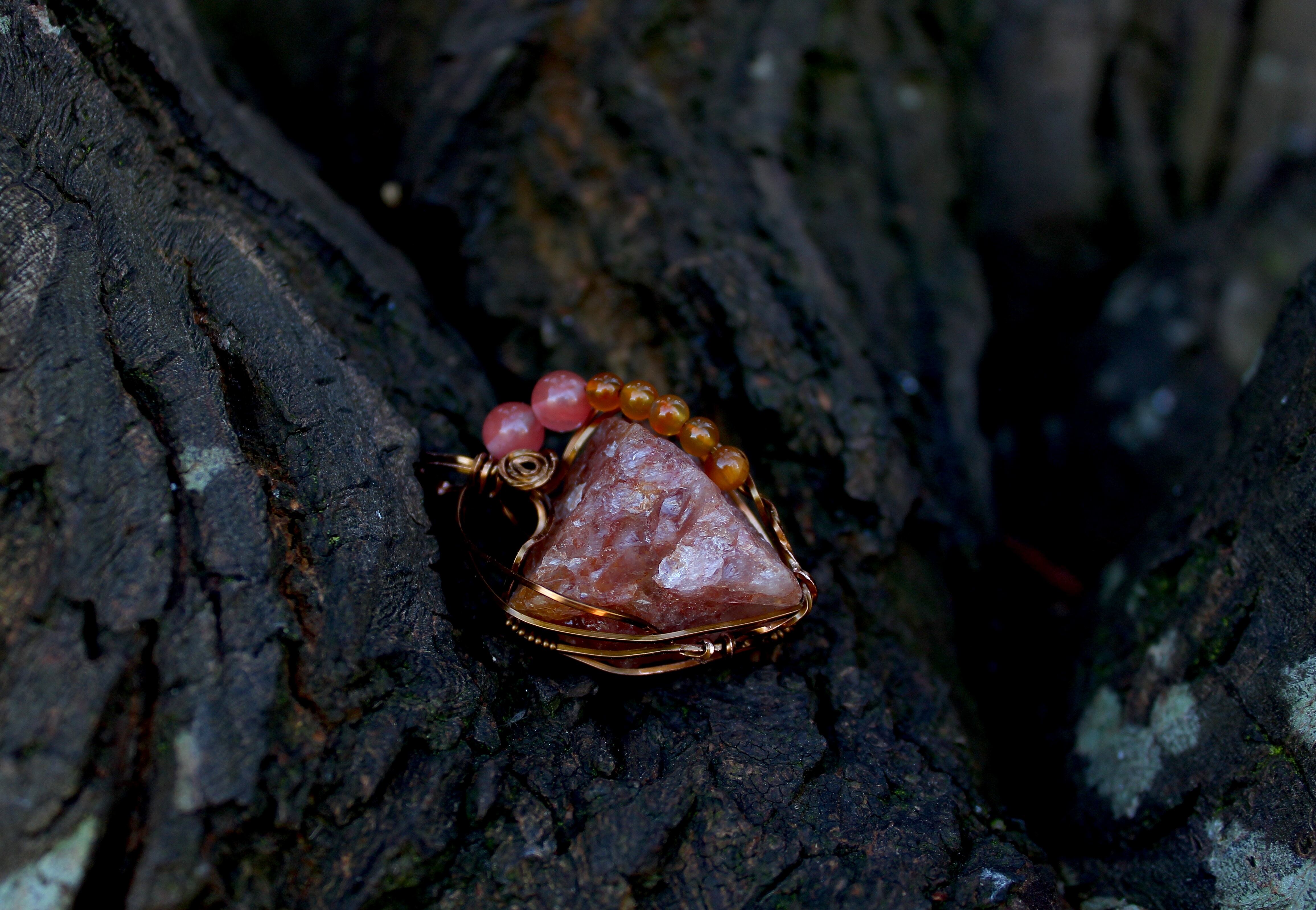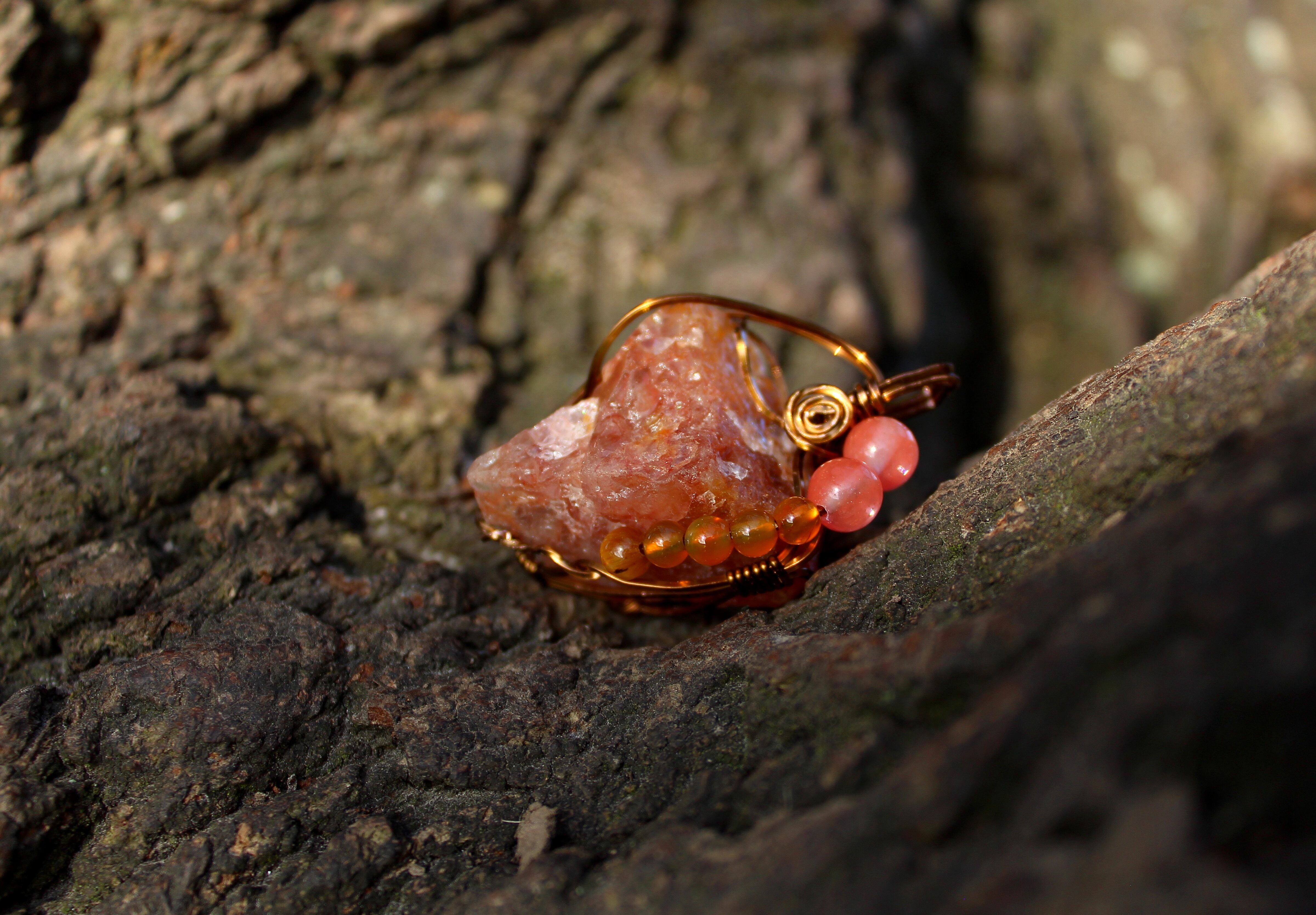 アンティークゴールドのワイヤーで巻いて、チェリークォーツとカーネリアンのビーズを組ませました。