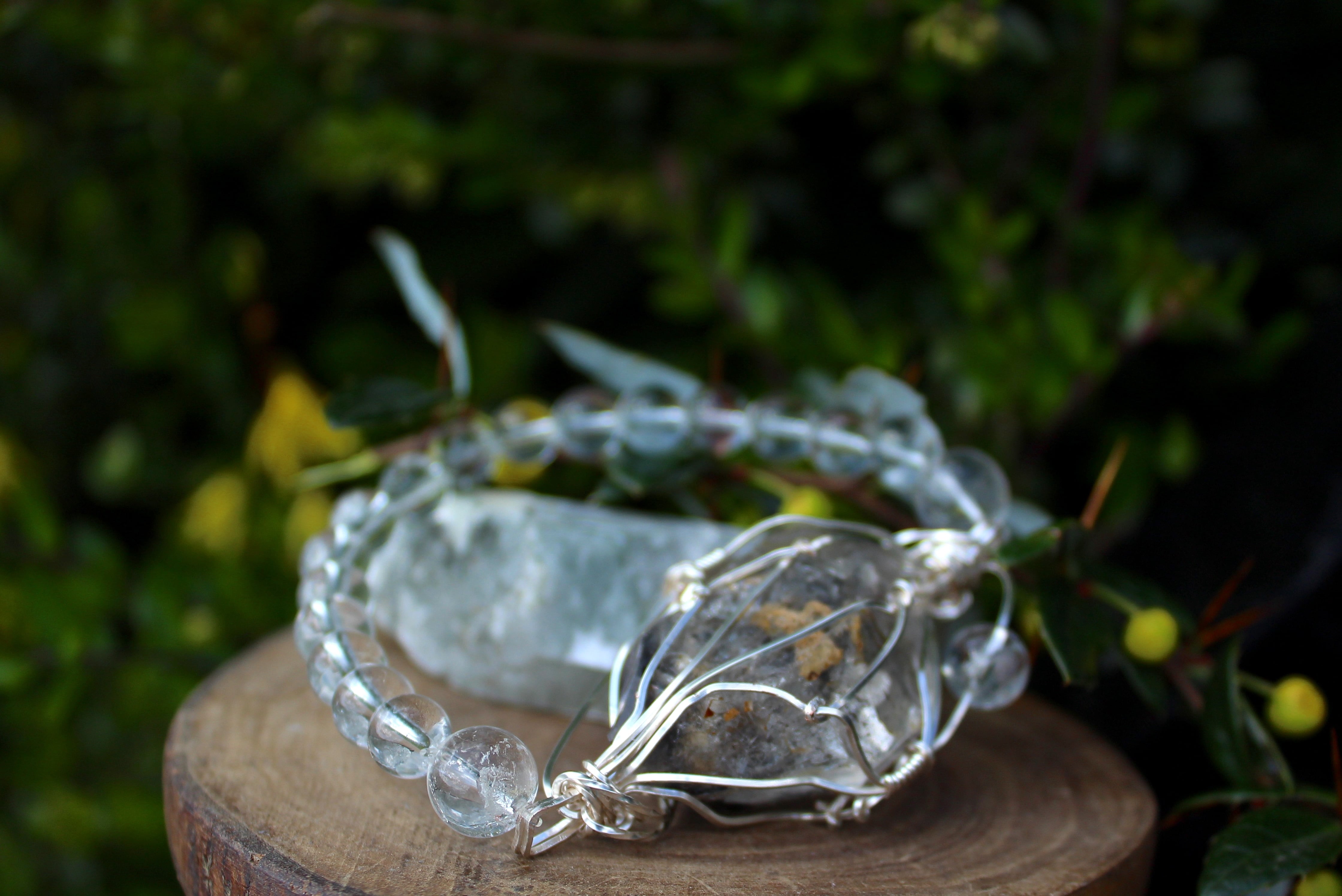 中心にブ大きなハーキマーダイアモンドの原石、シルバーのワイヤーで巻いて、8ミリの水晶をアレンジしてあります。10ミリの水晶と8ミリの水晶を合わせて、ブレスレットに仕上げました。
