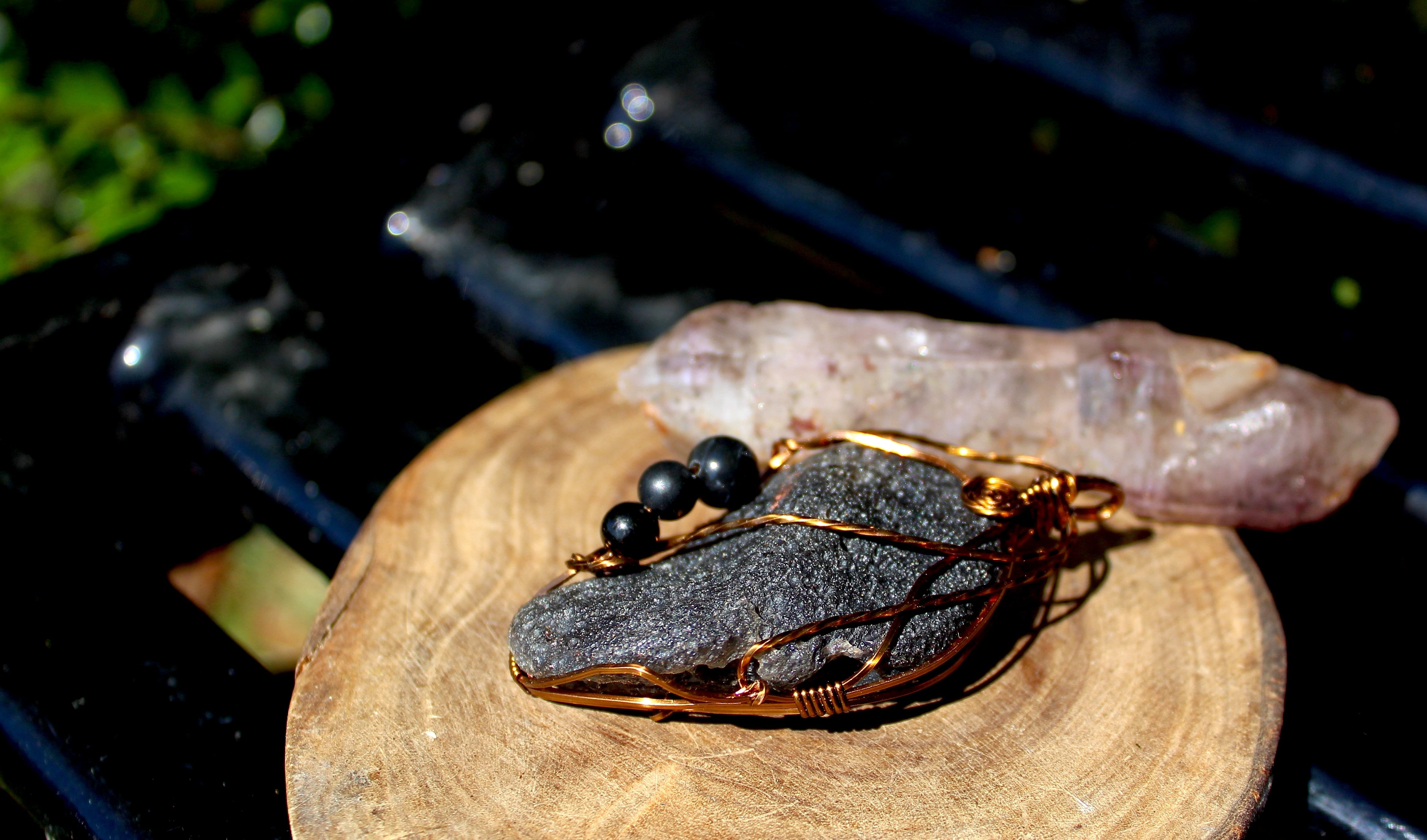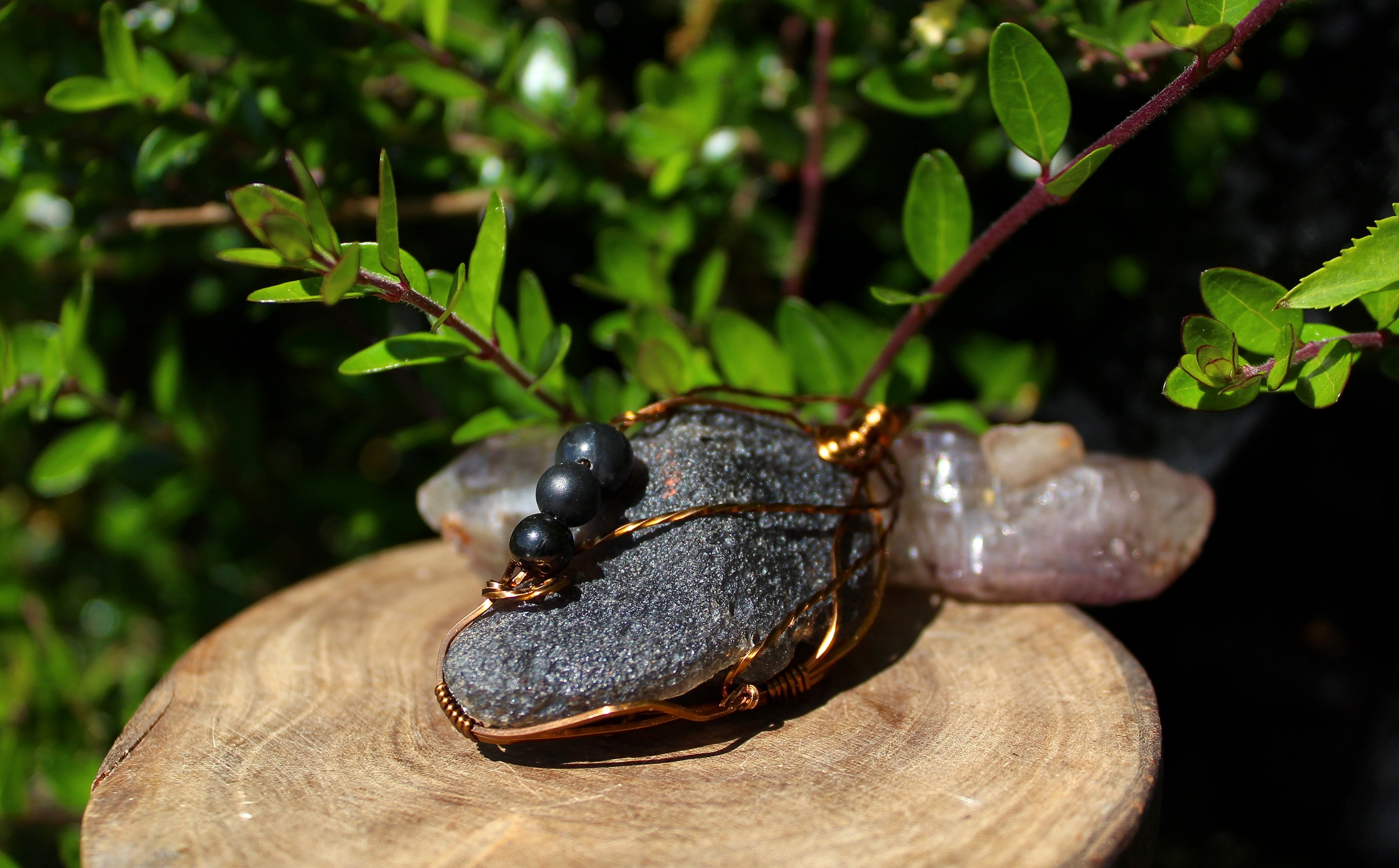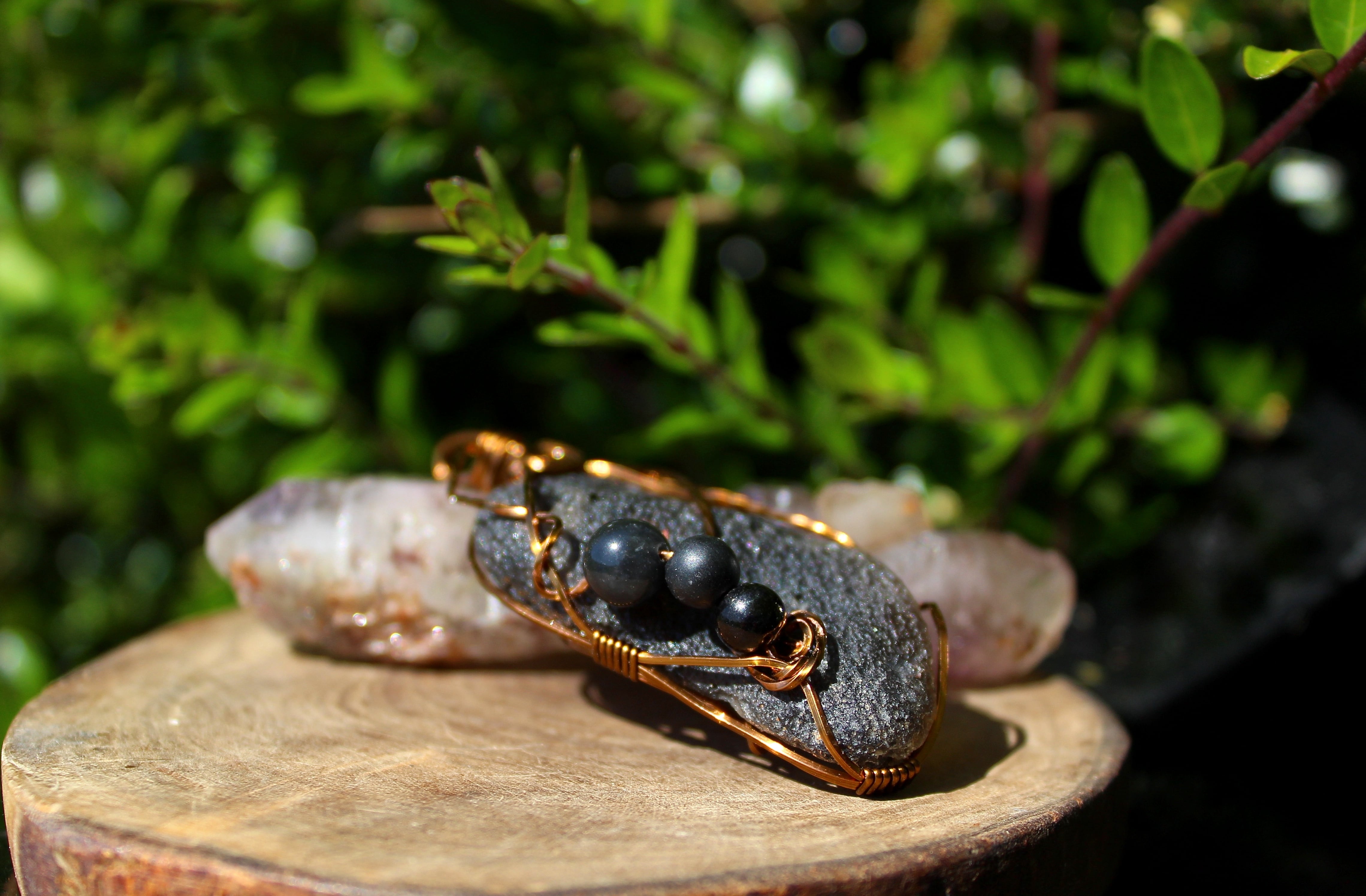 非常に大きくて形も美しい、チンターマニストーンです。アンティークゴールドのワイヤーで巻いて、アグニマニタイト、シュンガイト、オニクスのビーズをあしらいました。