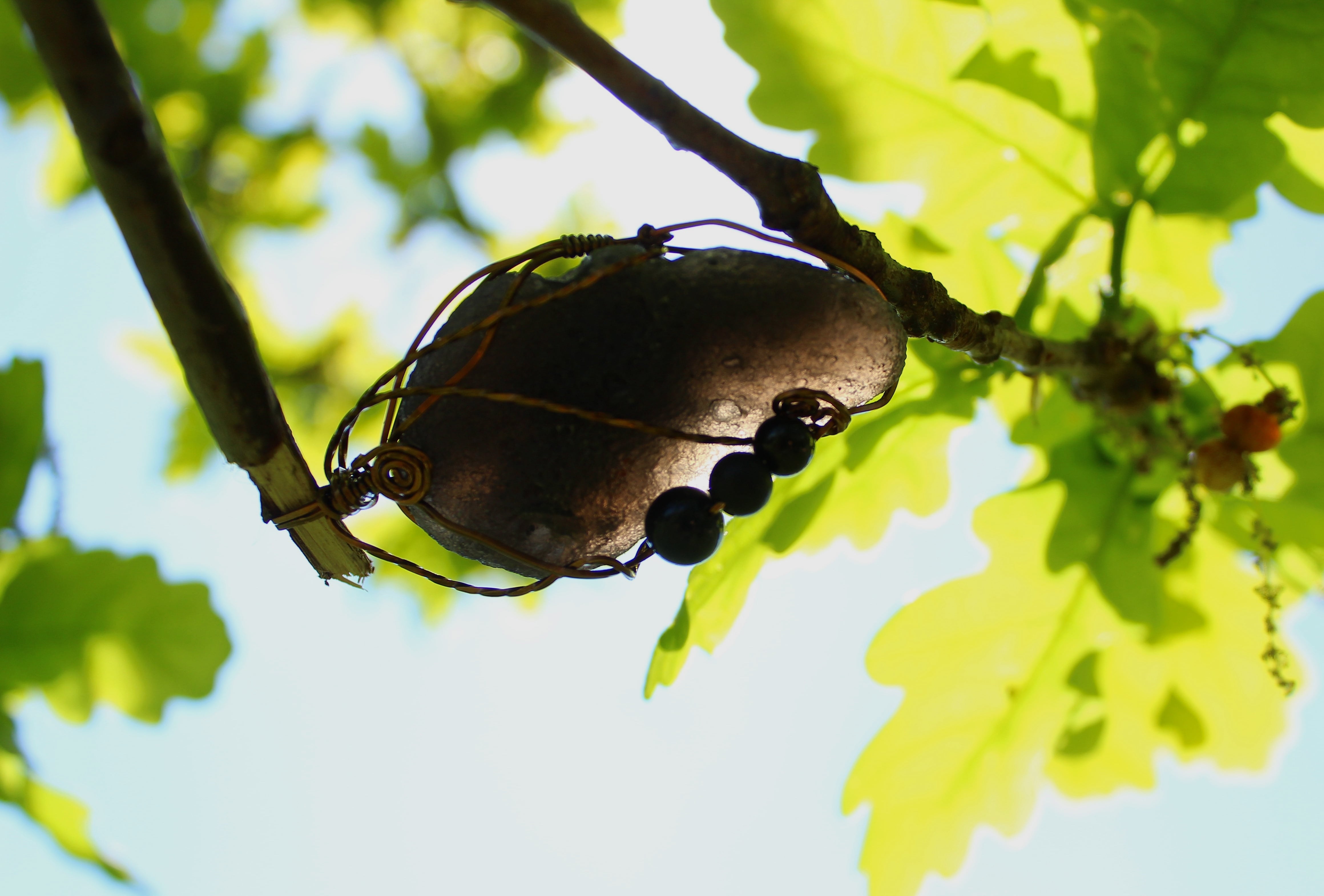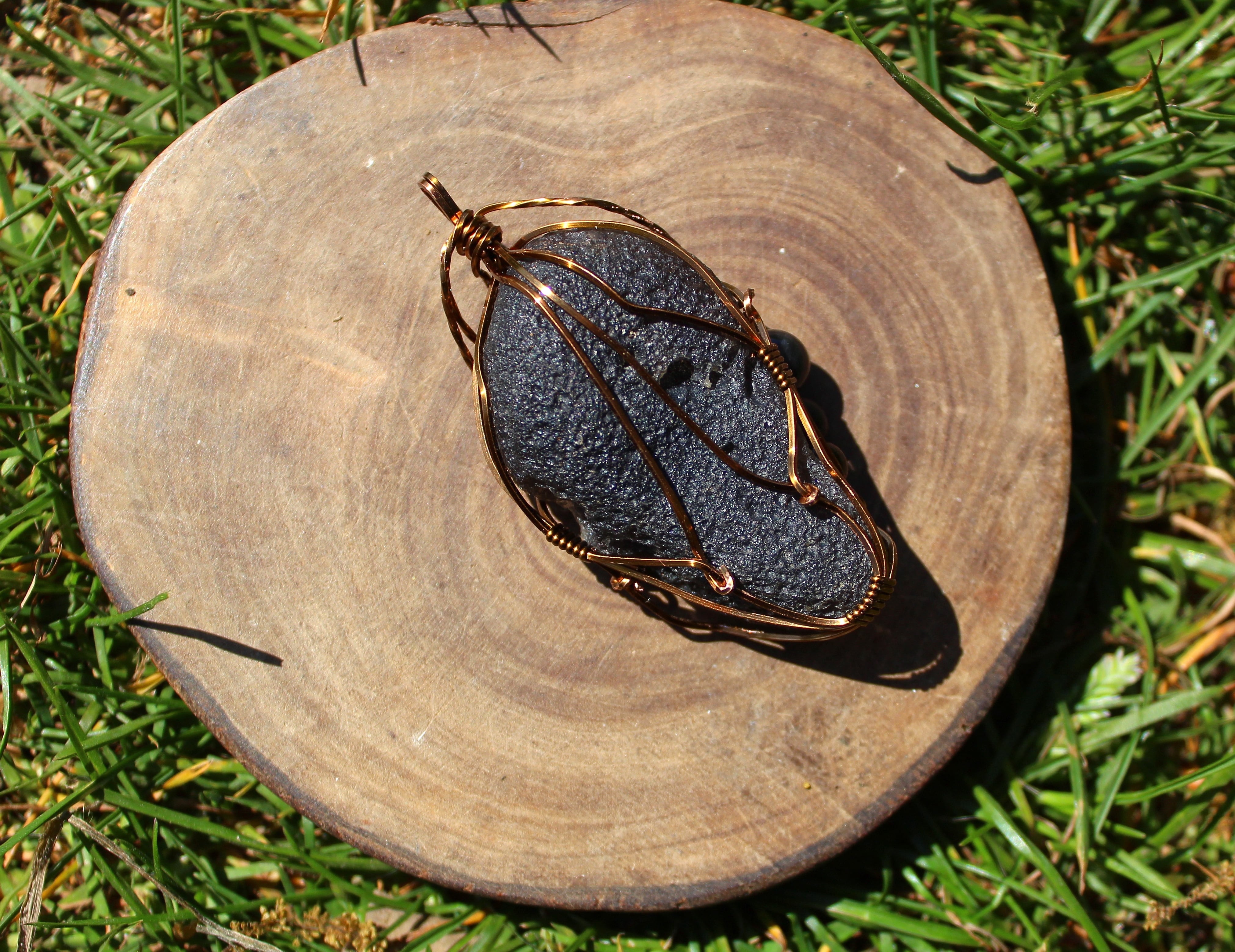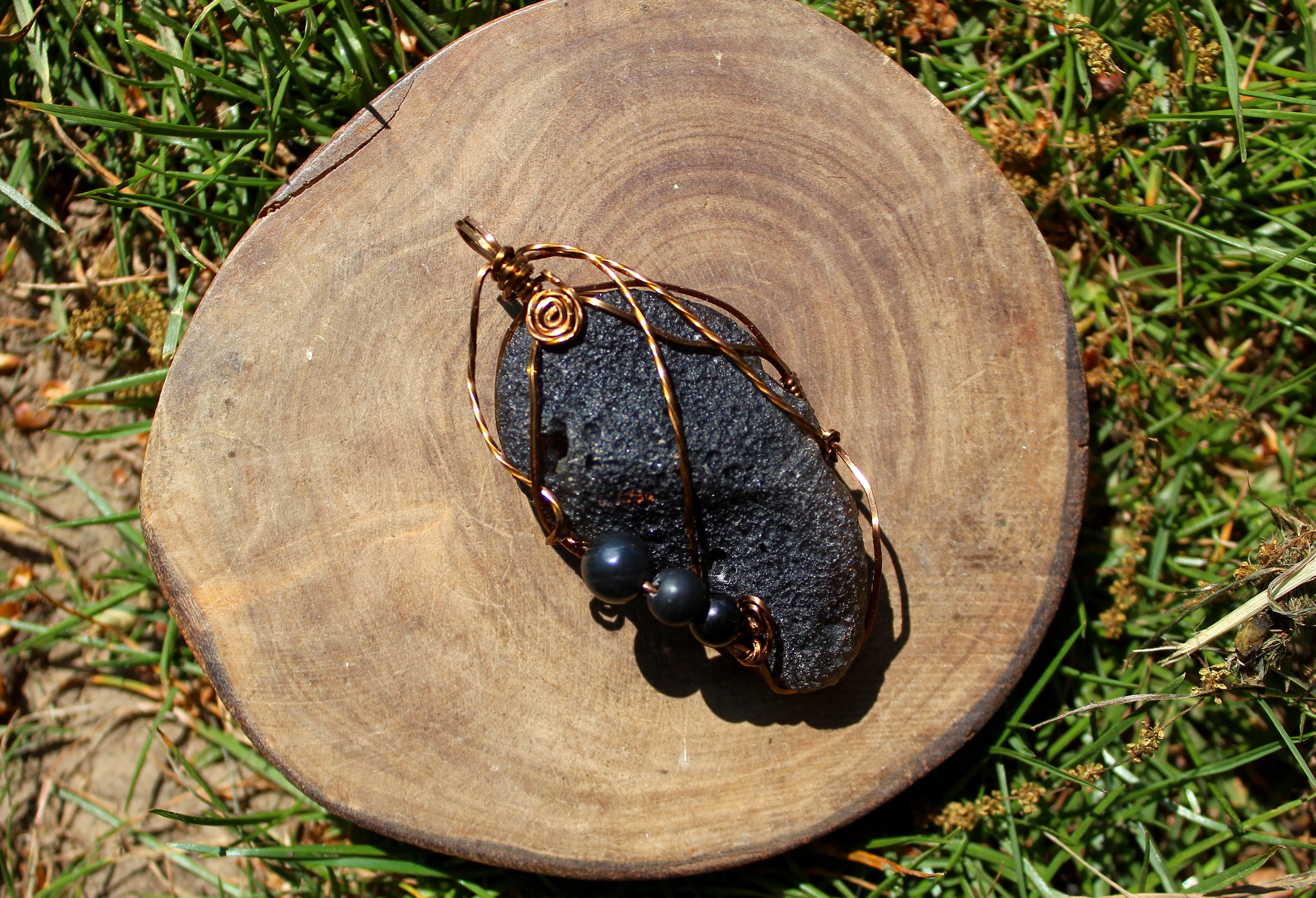 非常に大きくて形も美しい、チンターマニストーンです。アンティークゴールドのワイヤーで巻いて、アグニマニタイト、シュンガイト、オニクスのビーズをあしらいました。