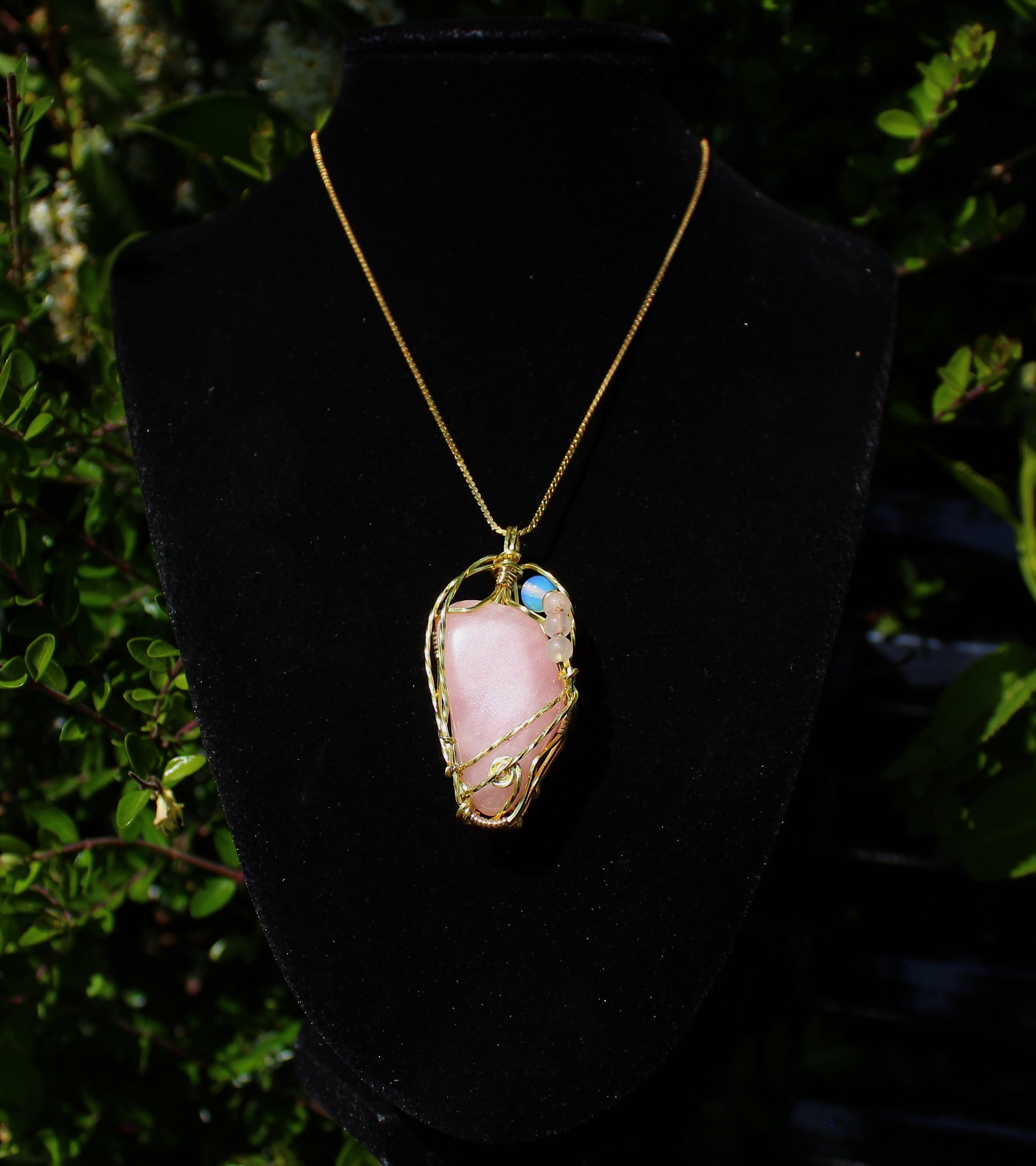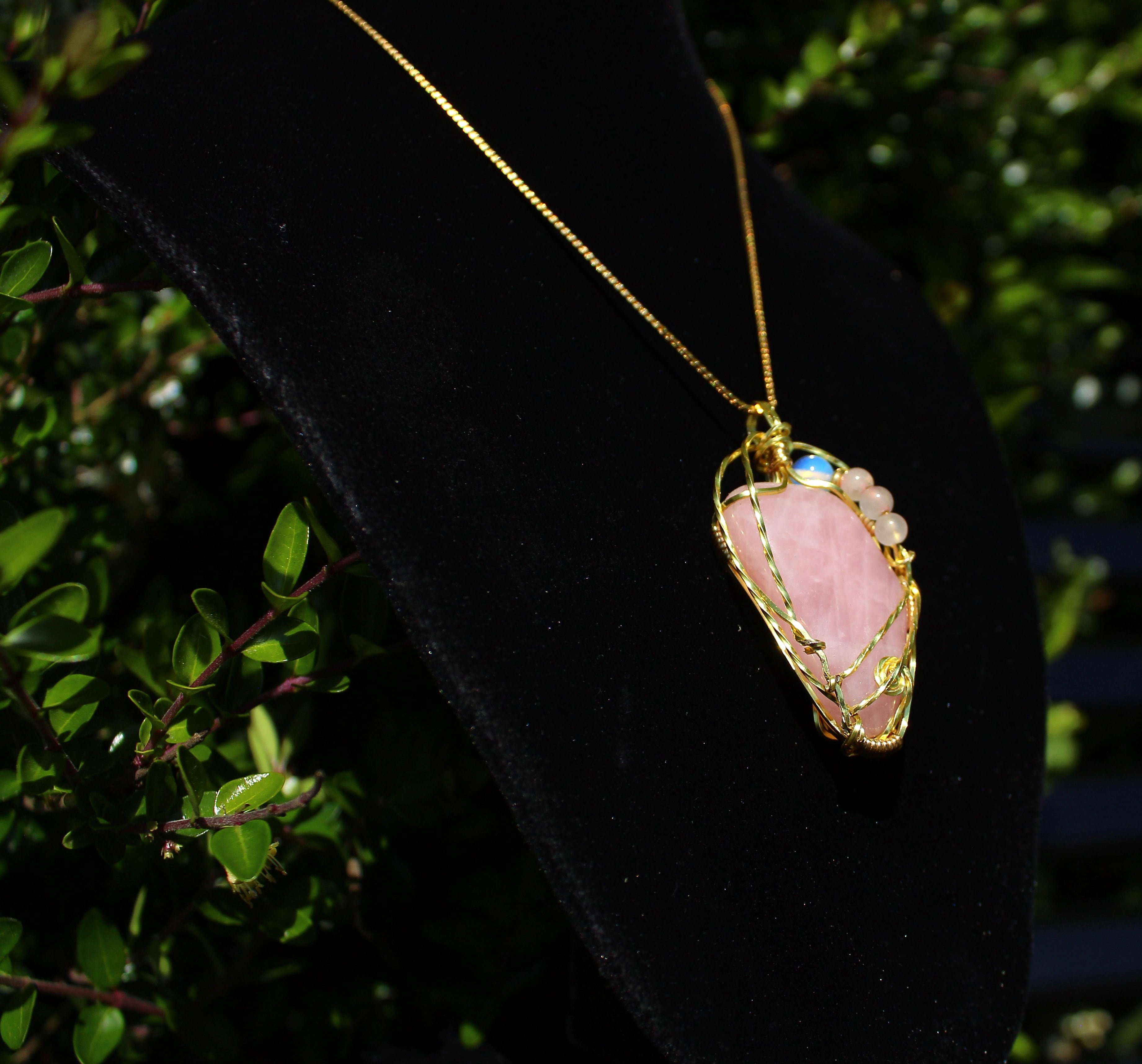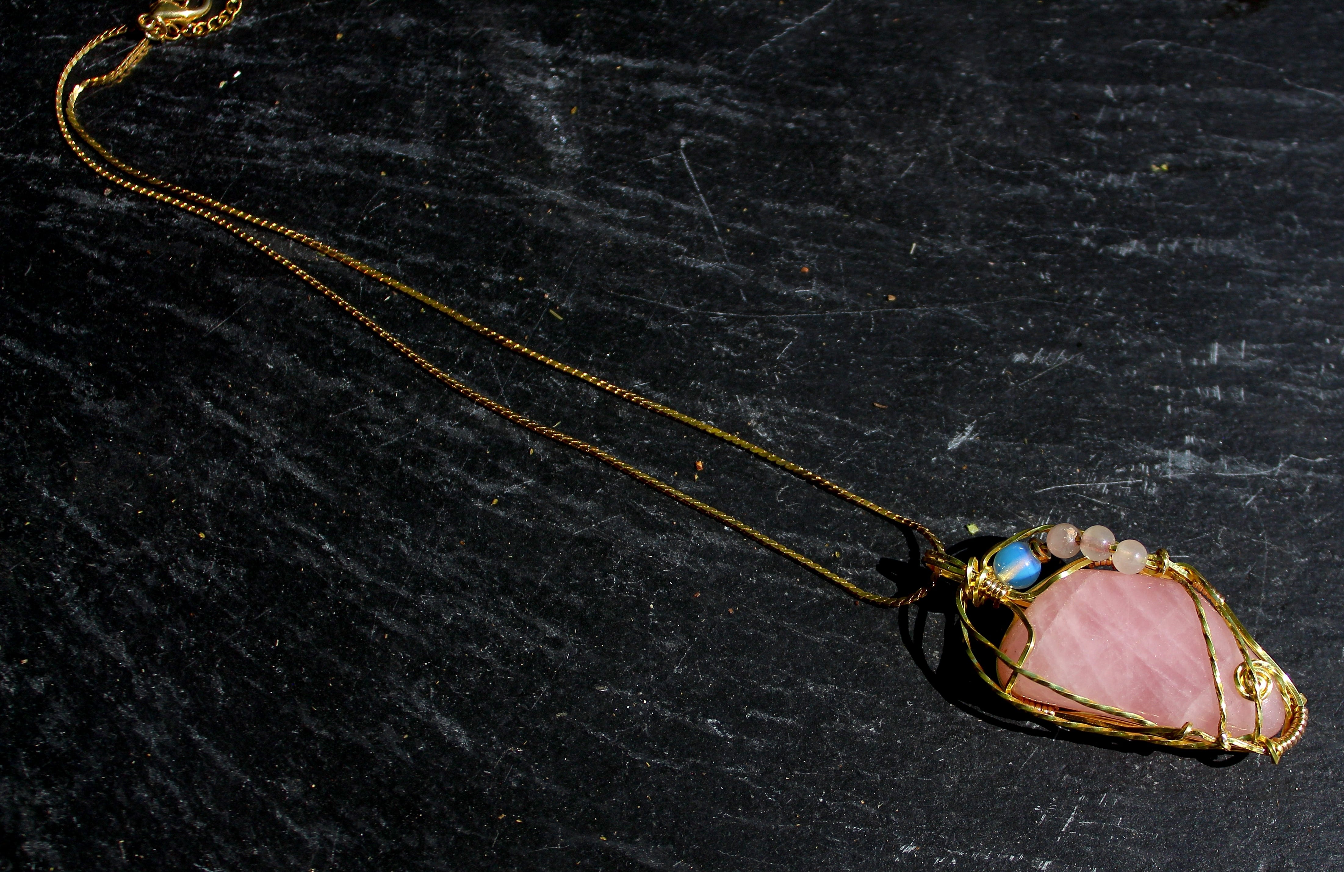 ゴールドのワイヤーで巻いて、オパライトとローズクォーツのビーズを止めつけました。