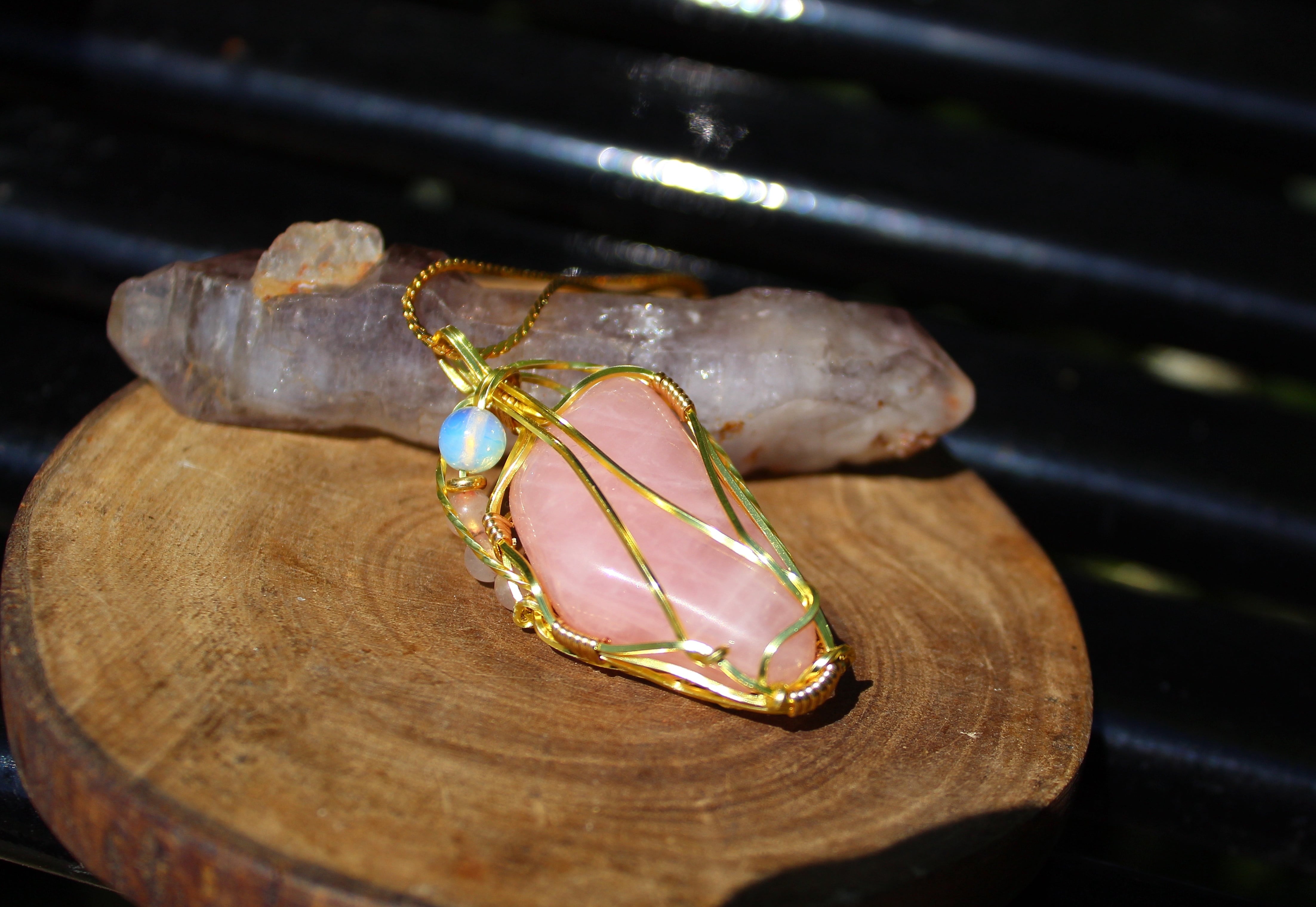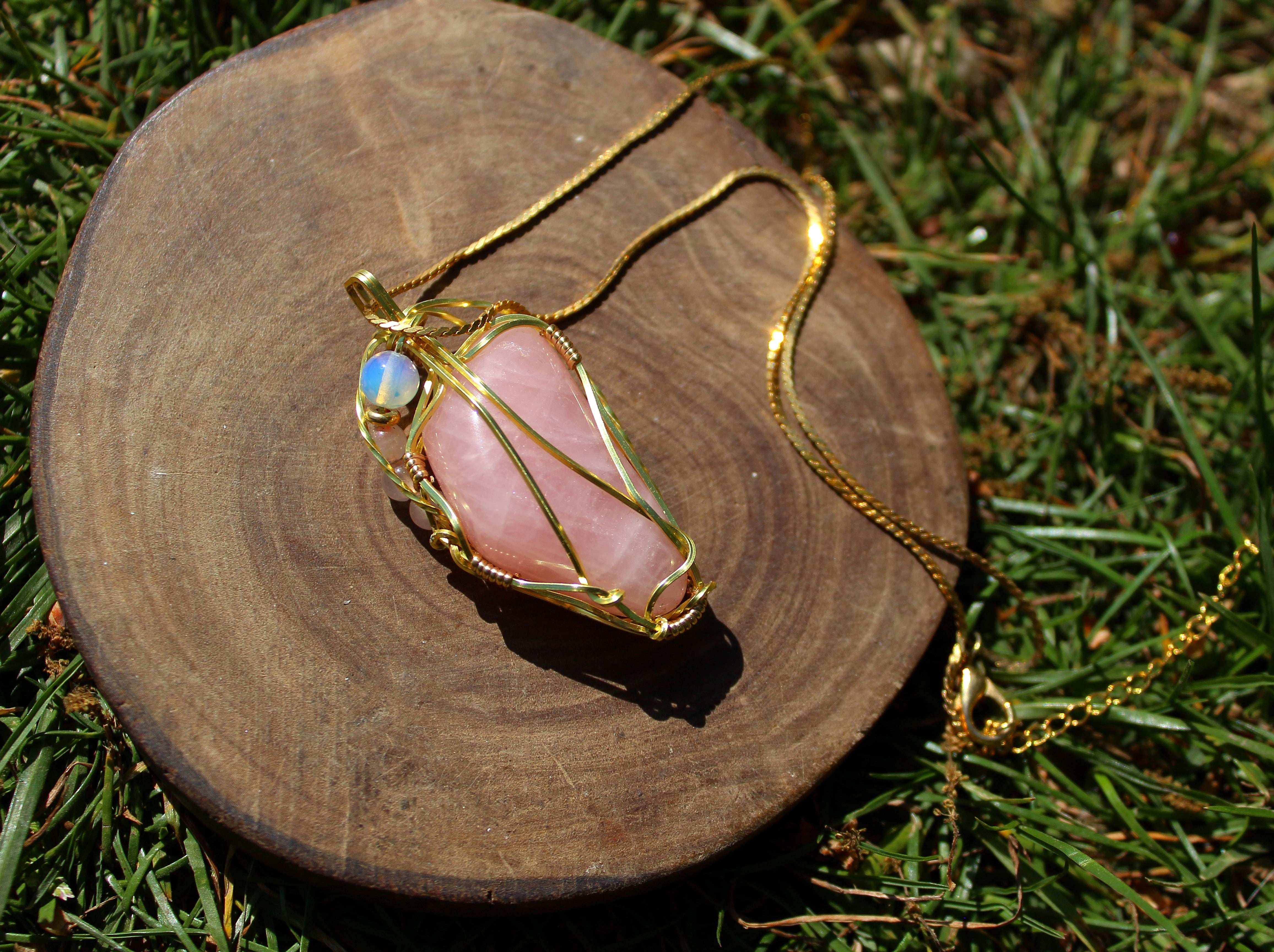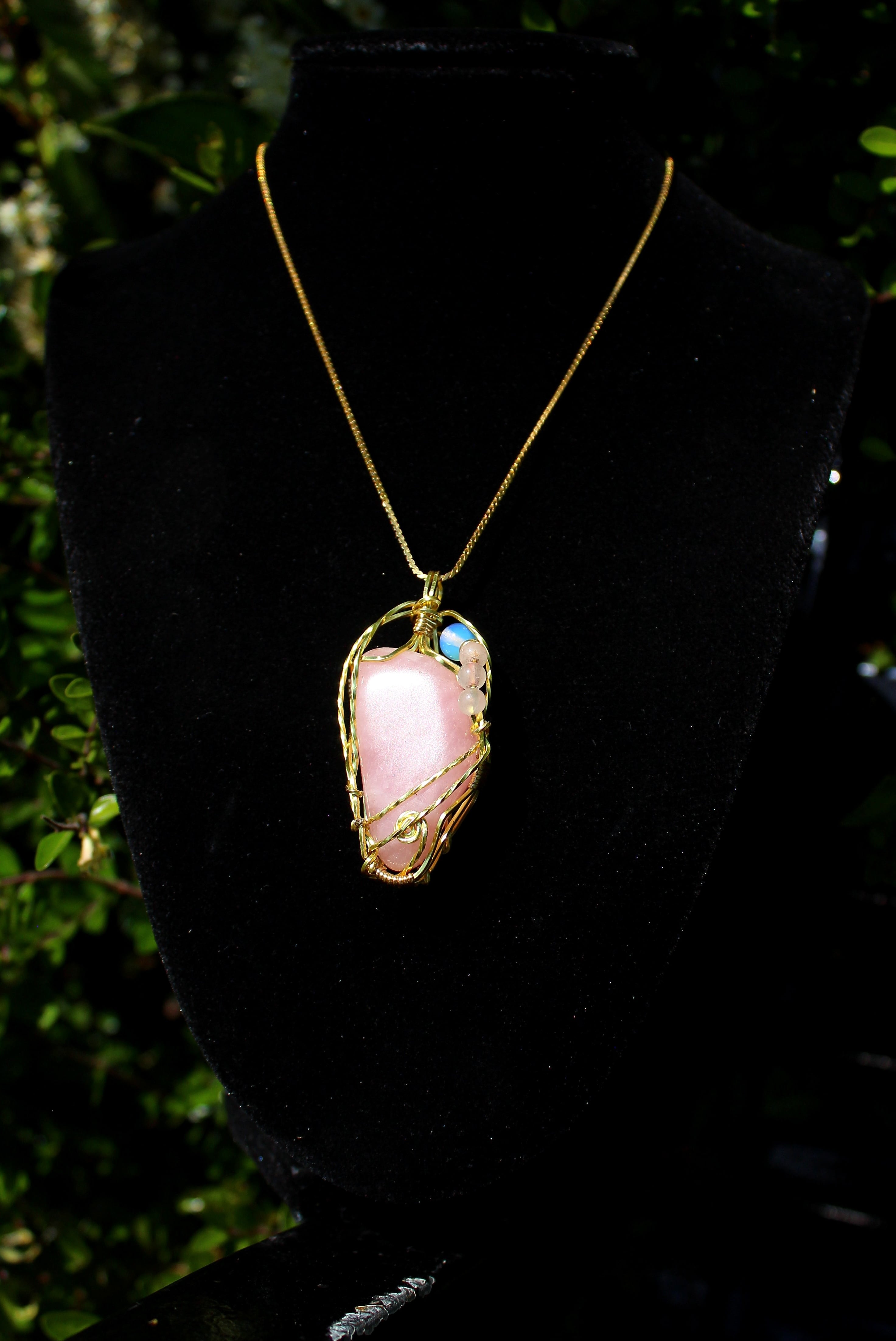 ゴールドのワイヤーで巻いて、オパライトとローズクォーツのビーズを止めつけました。