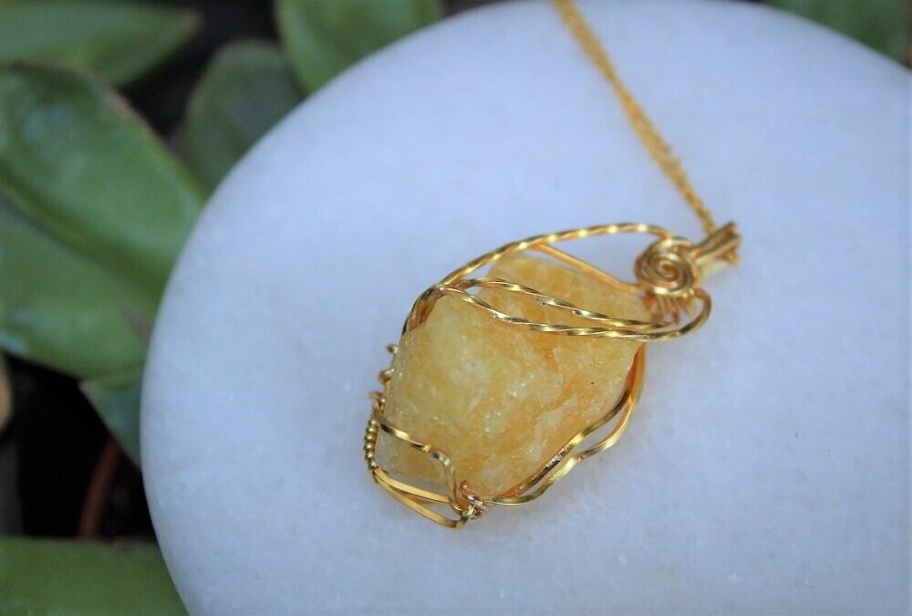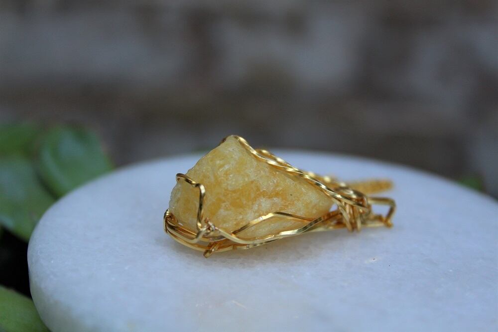 イエローアグニサンシャインダンビュライトのタンブルを、ゴールドのワイヤーで巻きました。ゴールドチェーン付きです。