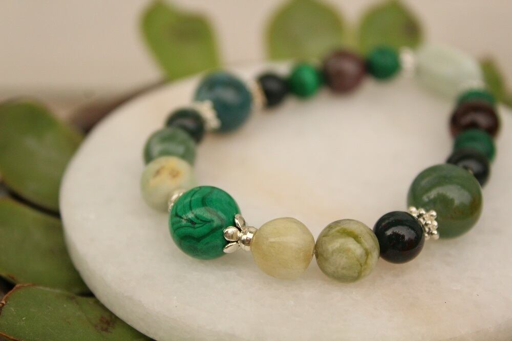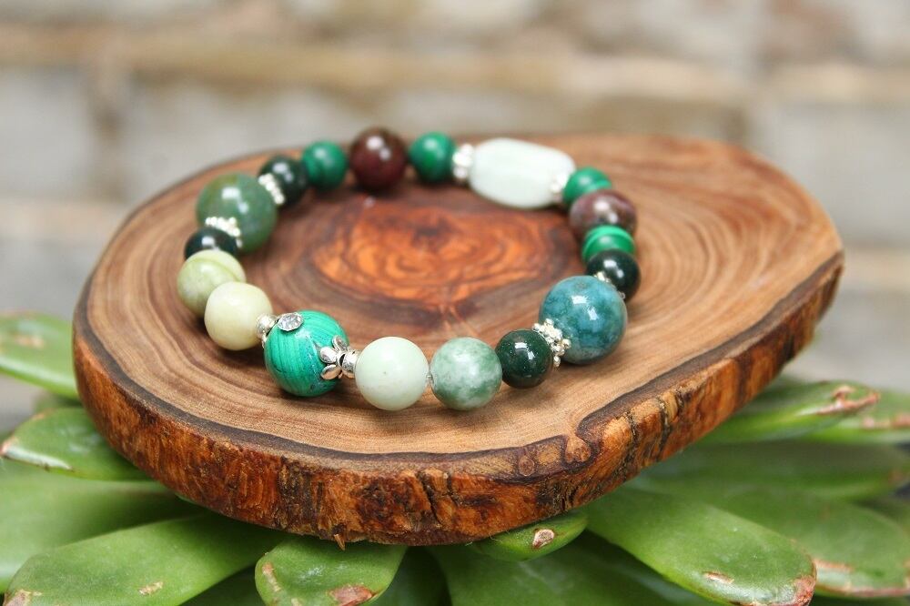 体内の毒素を洗い流す毒だしの石マラカイトを中心に、血液の働きを助けて毒素を取り除くブラッドストーン、やはり毒素を排出する手助けをする翡翠、解毒作用のあるエメラルドを組ませました。癒し効果の高い石、その中でも毒だしの効果が期待できる石を選んでいます。