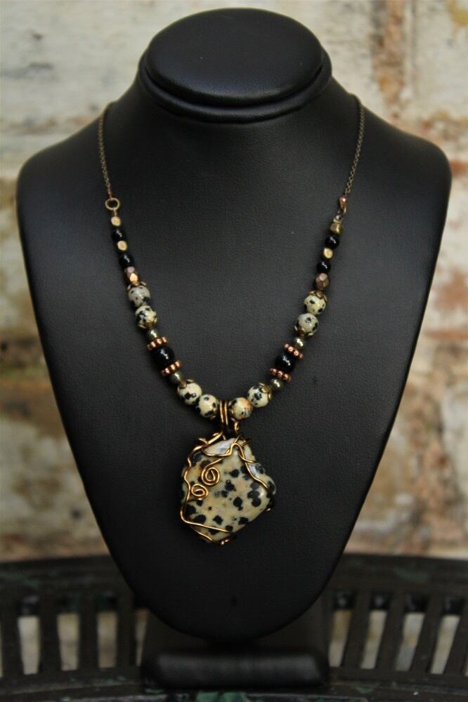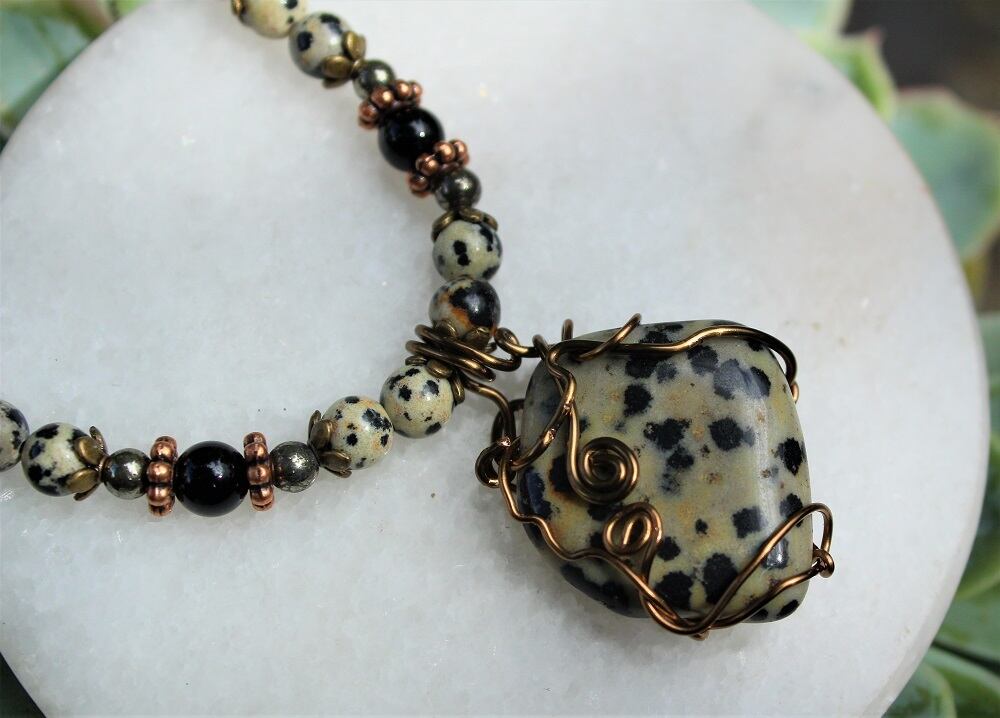 ダルメシアンジャスパーのタンブルをアンティークゴールドのチェ―ンで巻きました。落ち着きのある色目のダルメシアンジャスパーなので、アンティークゴールドのワイヤーでシックに仕上げました。