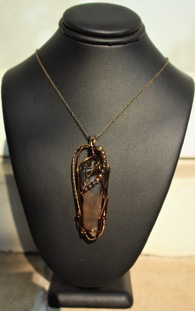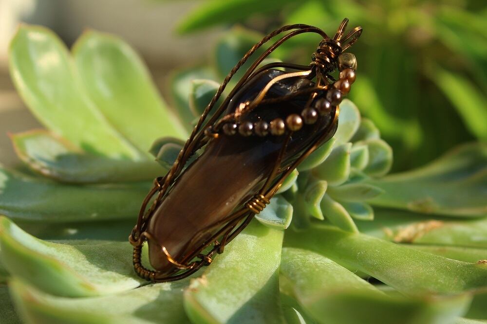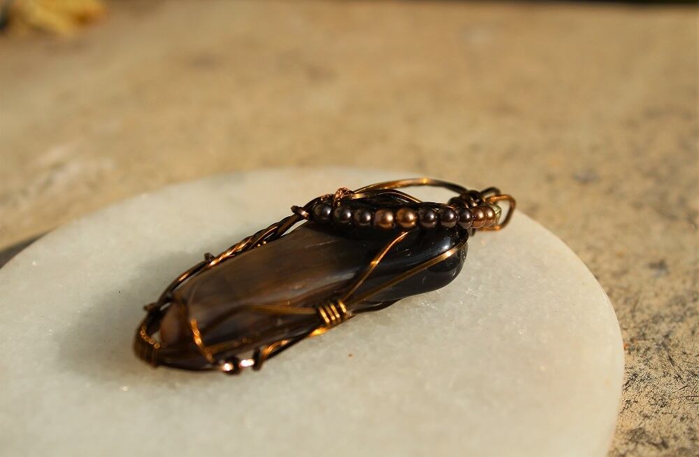 深みのあるシックな色合いのピーナッツウッドストーンをアンティークゴールドのワイヤーで巻いて、ビーズをポイントに付けました。