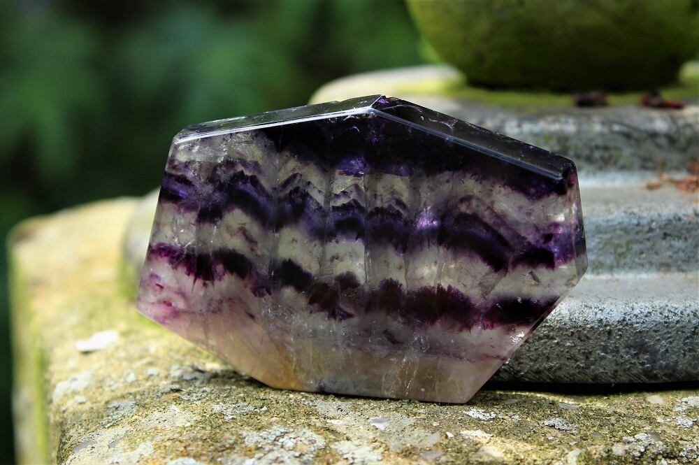 フローライトの研磨された原石です。パープル、青、白の美しい柄が表れているフローライトです。