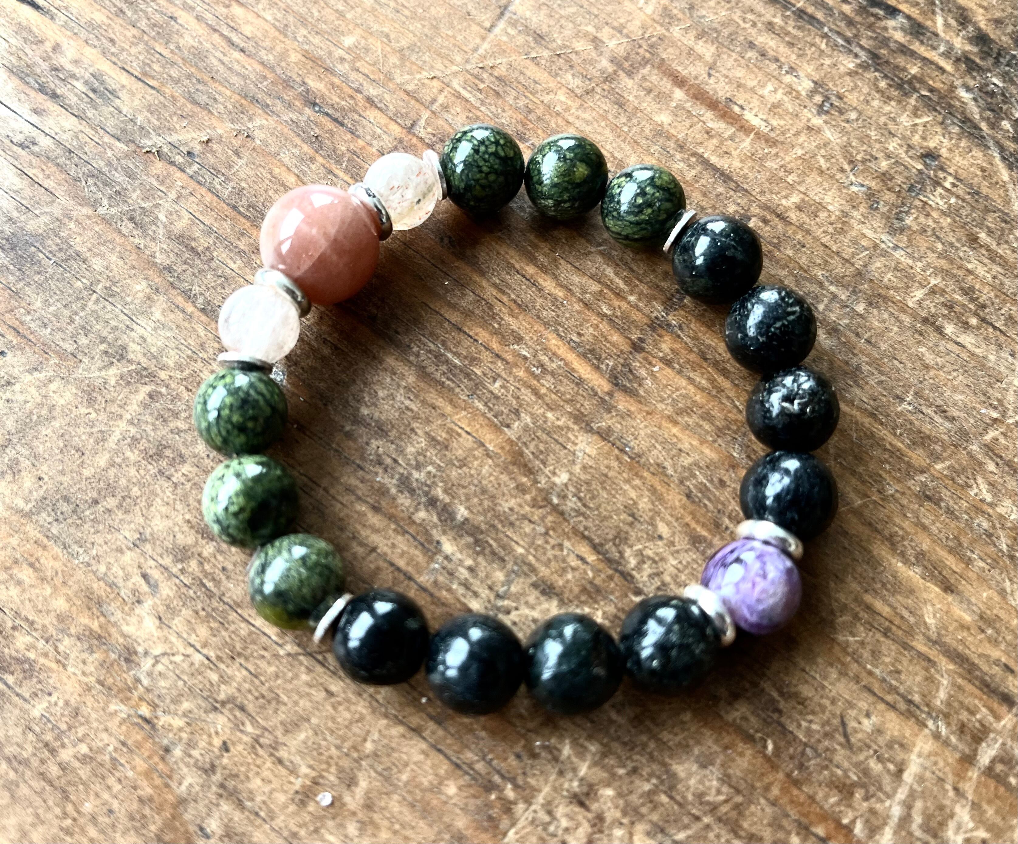 中心に10ミリのサンストーン、8ミリのサンストーン。続いて10ミリのサーペンティンを3個づつ、10ミリのバイオタイトを3個づつ。最後に10ミリのチャロアイトをセットしました。