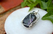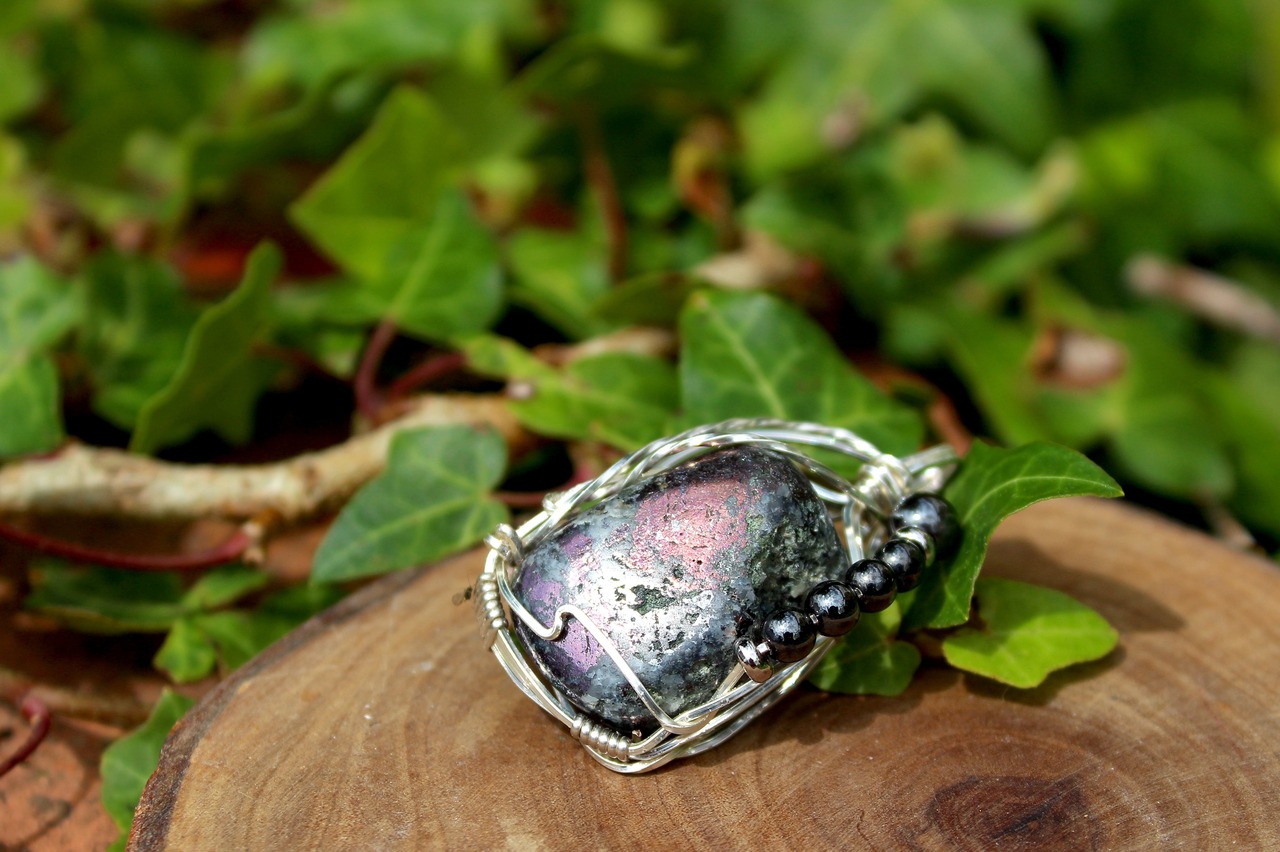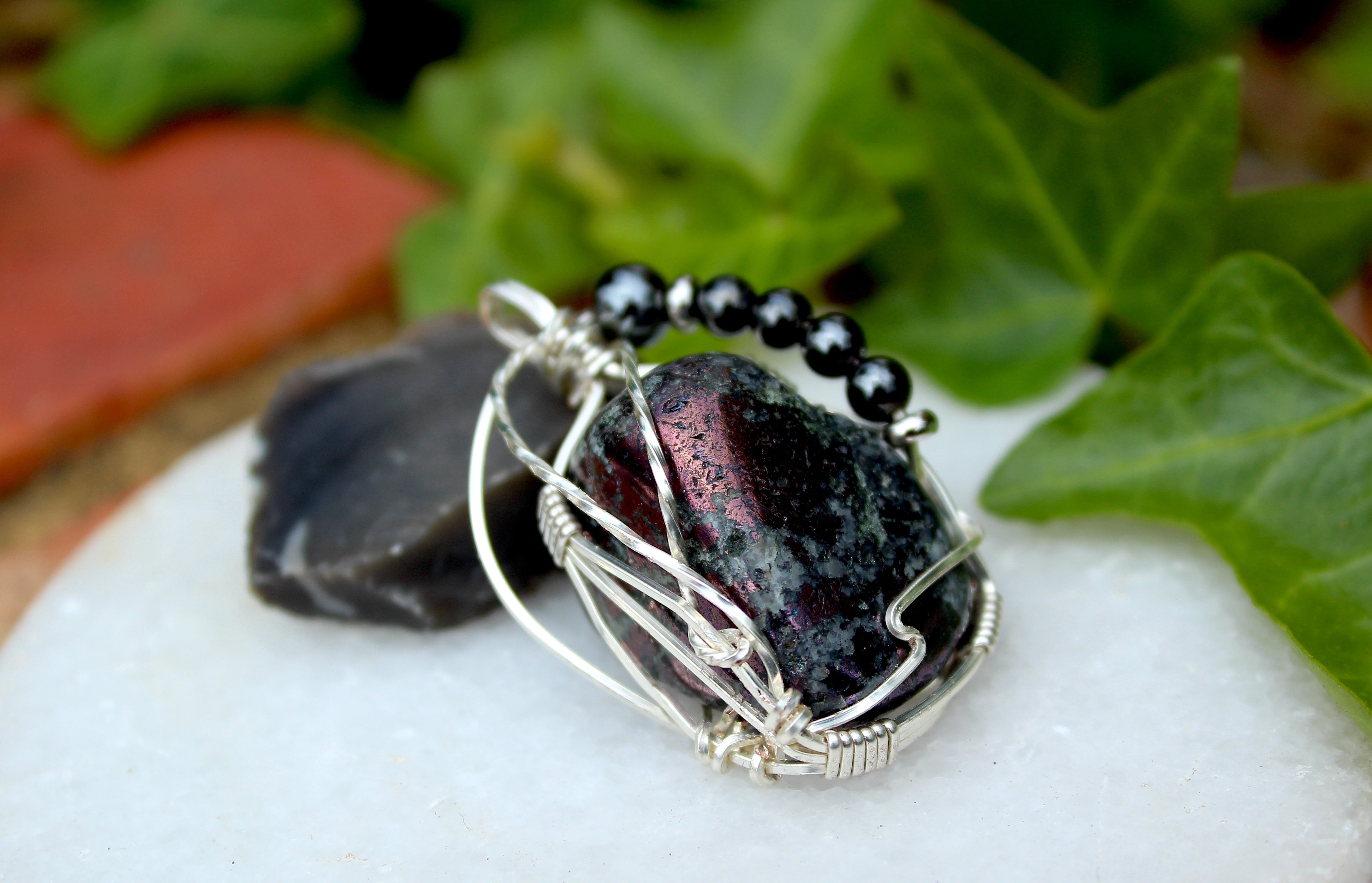 コベライトのタンブルをシルバーのワイヤーで巻きました。ヘマタイトの4ミリと6ミリをあしらいました。